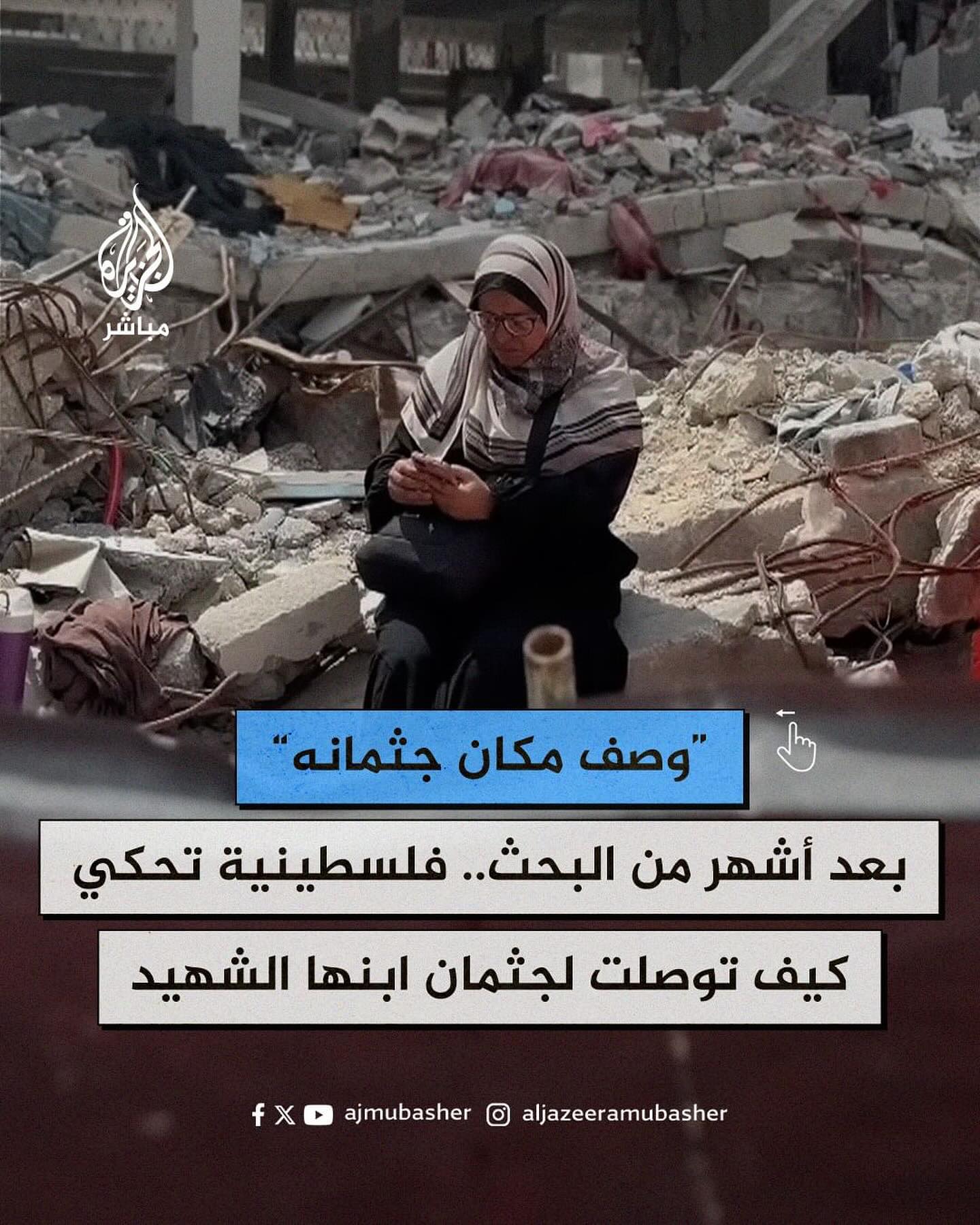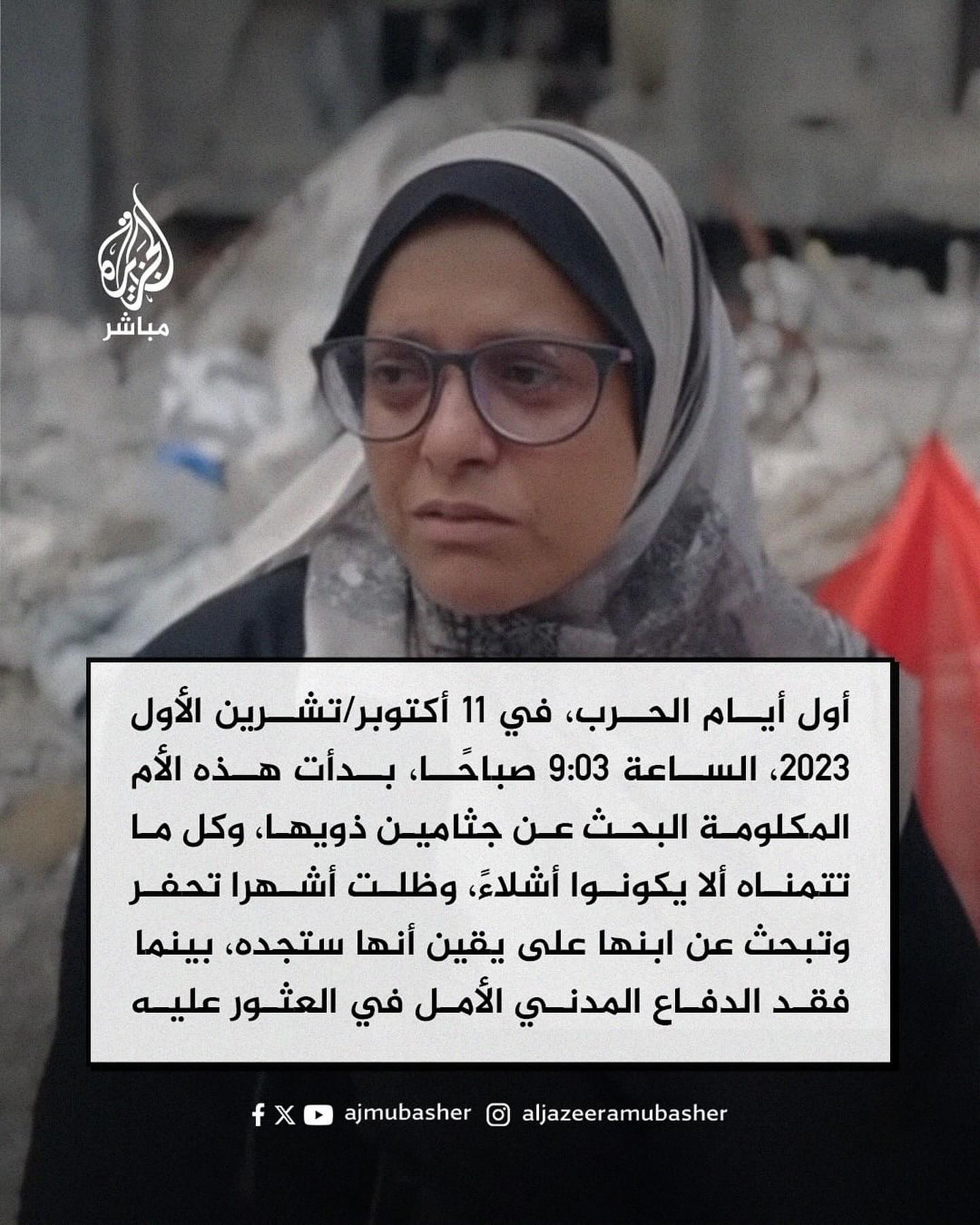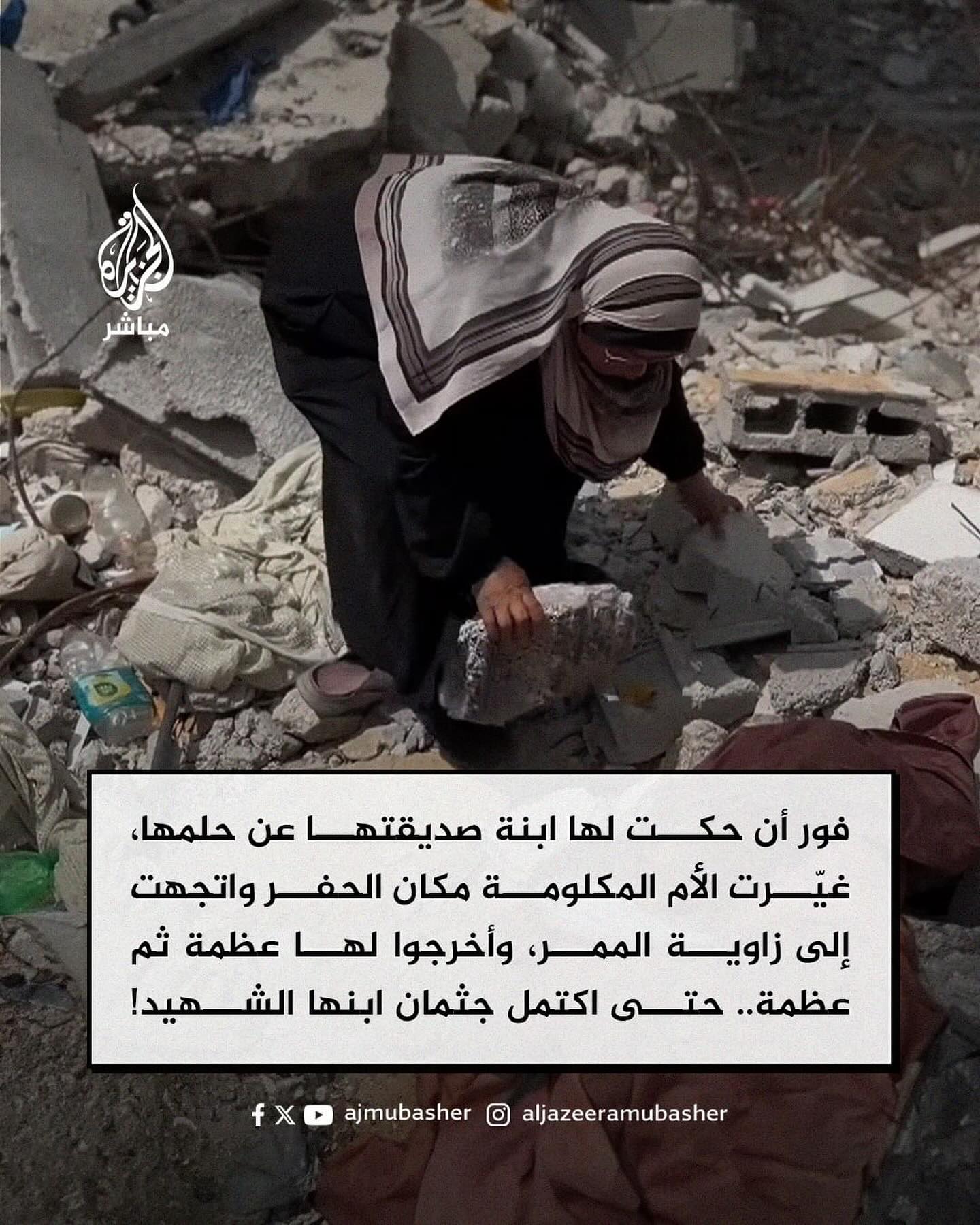 From my report to AlJazeera Mubashar: A mother in Gaza shares her painful experience as she retrieved the body of her martyred son ‚Azeemat Al-Adhma‘ after 148 days of his martyrdom. He had been buried under three floors of rubble following an Israeli occupation airstrike. She discovered his location after he appeared in a dream to her friend’s daughter, describing exactly where he was stuck. After this revelation, she was able to recover his remains. من تقريري لقناة الجزيرة مباشر: أُم في غزة تروي تجربتها الأليمة حيث استخرجت جثة ابنها "عظمة عظمة" بعد ١٤٨ يوماً من استشهاده. كان ابنها مدفوناً تحت ثلاثة طوابق من الأنقاض بعد قصف إسرائيلي، وتمكنت من تحديد مكانه بعد أن ظهر في حلم لابنة صديقتها ووصف موقعه.