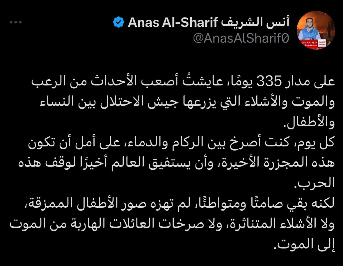 على مدار 335 يومًا، عايشتُ أصعب الأحداث من الرعب والموت والأشلاء التي يزرعها جيش الاحتلال بين النساء والأطفال. كل يوم، كنت أصرخ بين الركام والدماء، على أمل أن تكون هذه المجزرة الأخيرة، وأن يستفيق العالم أخيرًا لوقف هذه الحرب. لكنه بقي صامتًا ومتواطئًا، لم تهزه صور الأطفال الممزقة، ولا الأشلاء المتناثرة، ولا صرخات العائلات الهاربة من الموت إلى الموت.