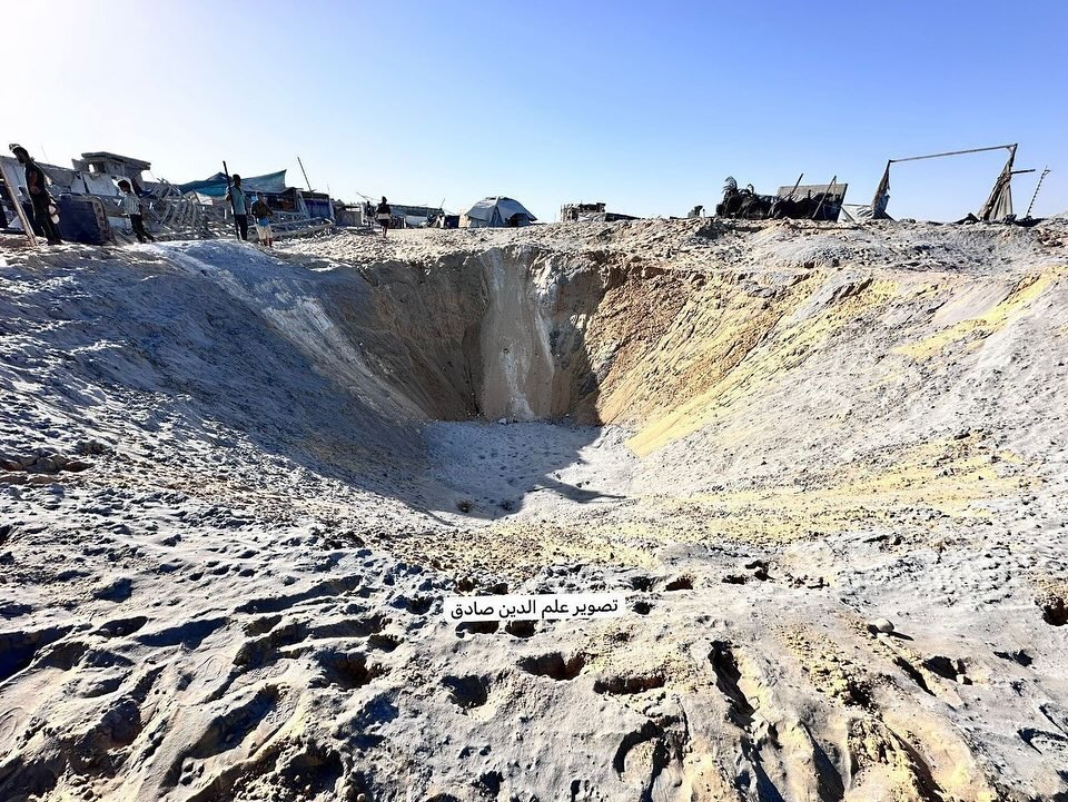شاهد دمار كبير لحق بخيام النازحين غرب خانيونس جراء قصف الاحتلال بالمنطقة الانسانية، تسبب القصف بحفرة عميقة بالمكان