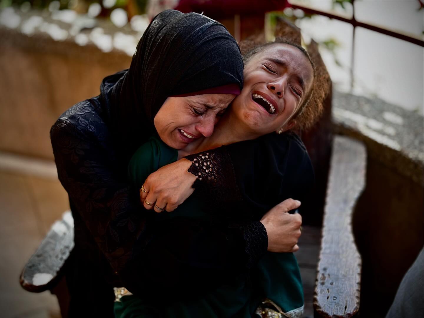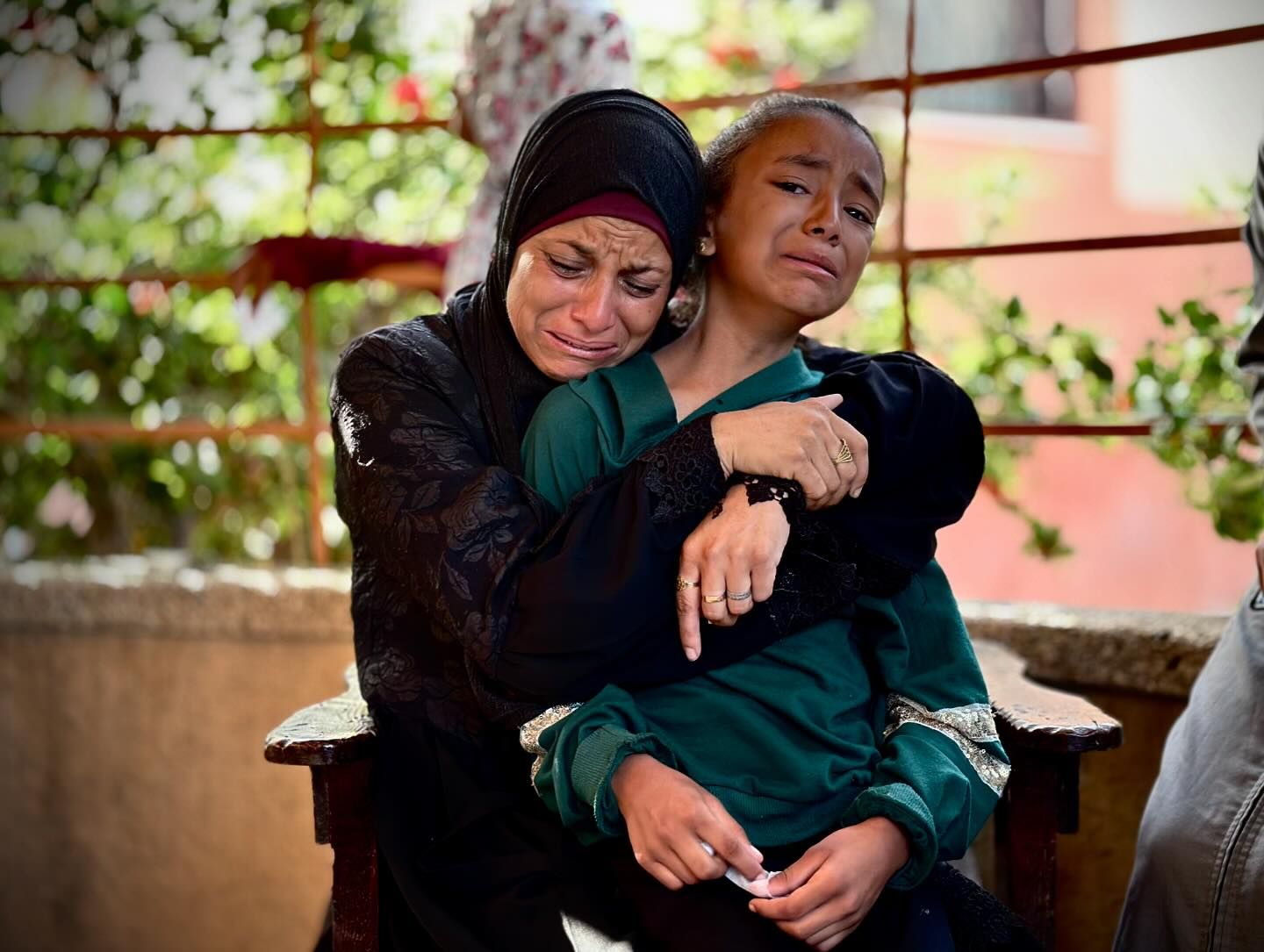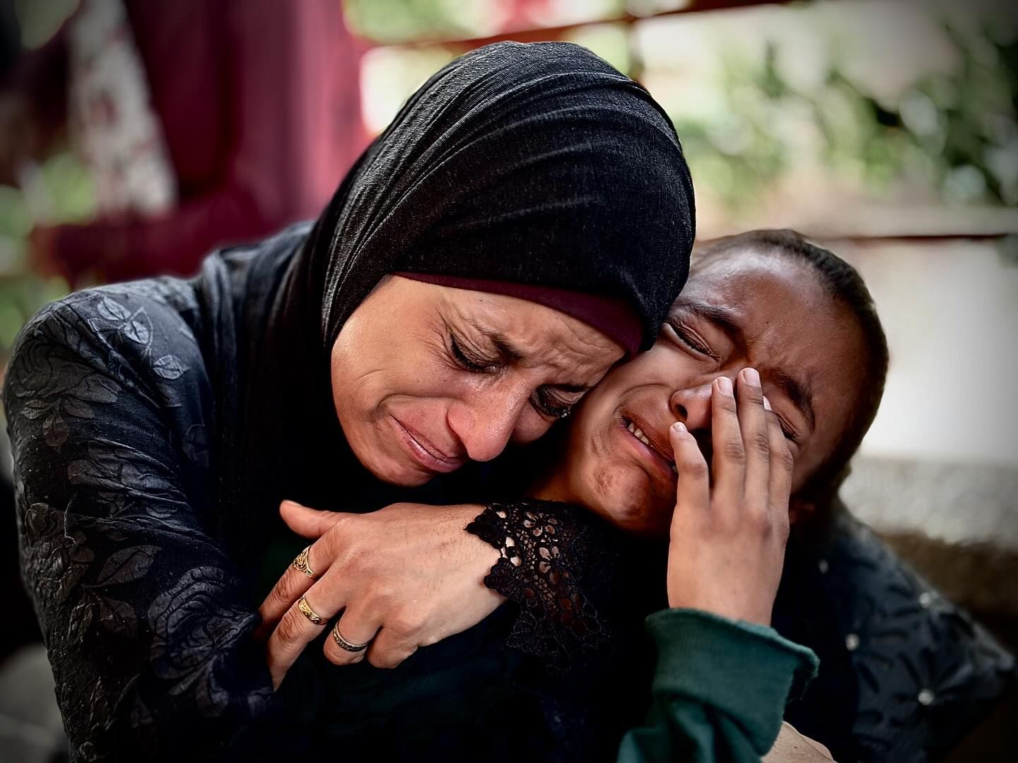 A mother hugs her daughter in a painful farewell to their family members who were killed by the Israeli occupation army