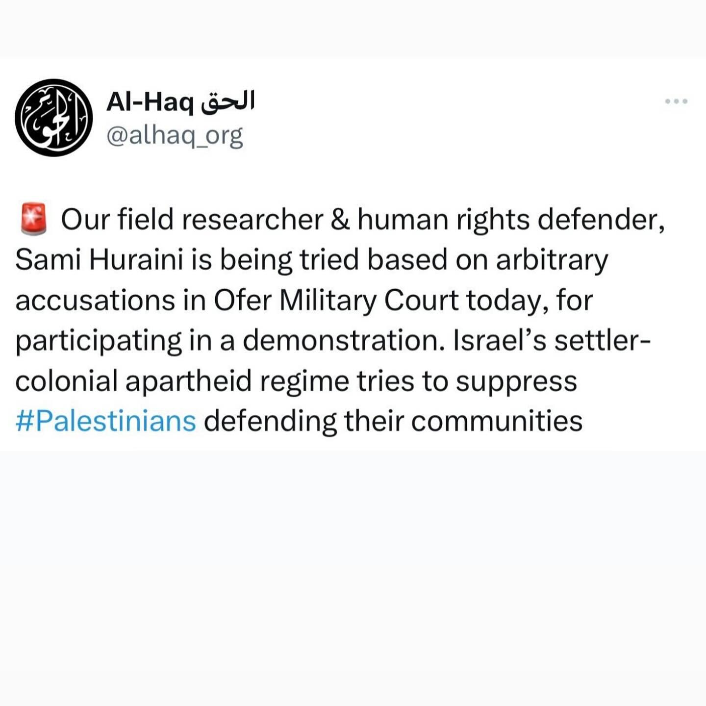 While the genocide going on here in Palestine by Israel Israel continue to target me and other human rights defenders to stop our activism and work we do to help out people to remain in the land despite occupation attacks Today at Ofer military my court was held my punishment court for my participation in demonstration in 2021 against the shooting and killing of Haroun Abo Aram in 2021 Haroun was shot and paralyzed two years later he passed away due to his injury may his soul rest in power , we refuse to die in silent and our work should and will continue. The court today postponed the decision to next court to issue the decision Which not clear yet when it will be I want to thank everyone for your amazing solidarity and support and all advocacy work that have been done to spot light in my case @frontlinedefenders @al_haq_organization @uscpr