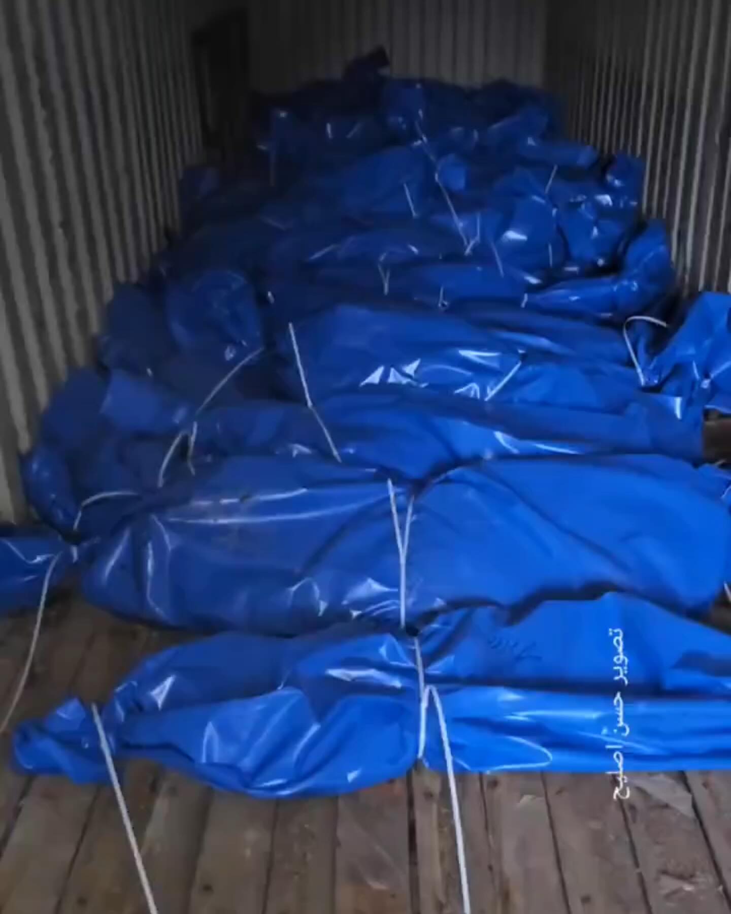 في داخل هذه الحاوية رفات 100 شهيد فلسطيني، كانوا مختطفين لدى جيش الاحتلال الإسرائيلي، أرسلهم لقطاع غزة بدون أي معلومات أو أسماء حتى لا تتعرف عليهم عائلاتهم. Inside this container are the remains of 100 Palestinian martyrs, who were kidnapped by the Israeli occupation army, which sent them to the Gaza Strip without any information or names so that their families would not recognize them.