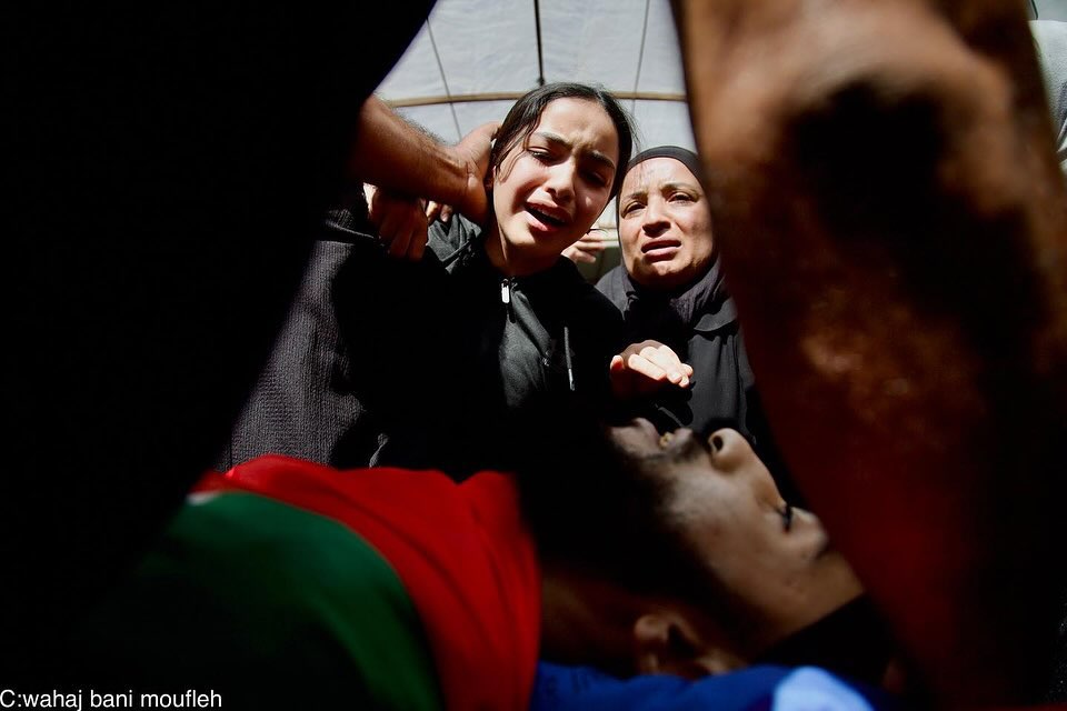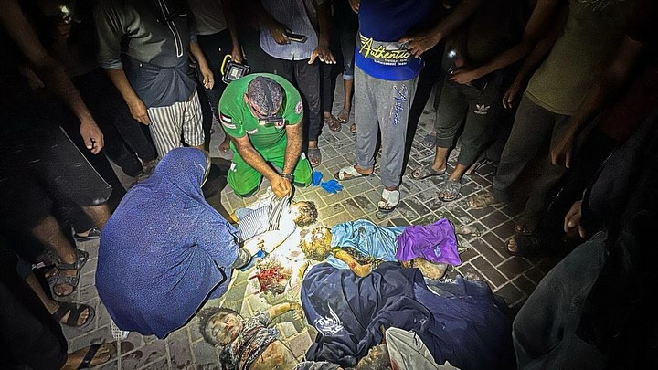 A Palestinian bid farewell to members of his family, including his sons and grandsons, who were killed in Israeli gunfire that targeted the tents of displaced Palestinians in the Nusairat refugee camp. By @nahed_hajjaj99 فلسطيني يودع عائلته “ أبناءه وأحفاده “ الذين ارتقوا الليلة جراء اطلاق النار بشكل مباشر على خيام النازحين في مخيم النصيرات وسط القطاع