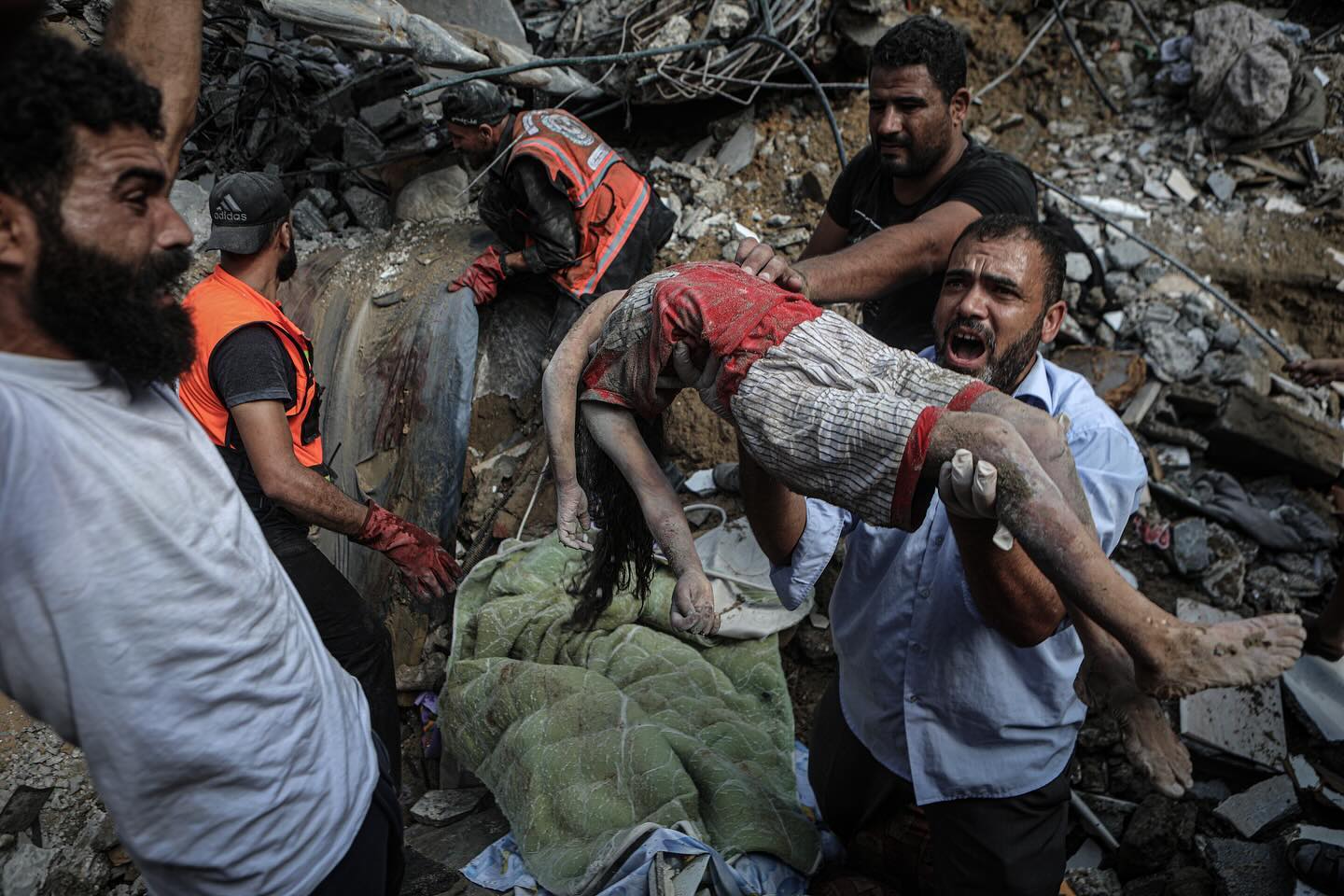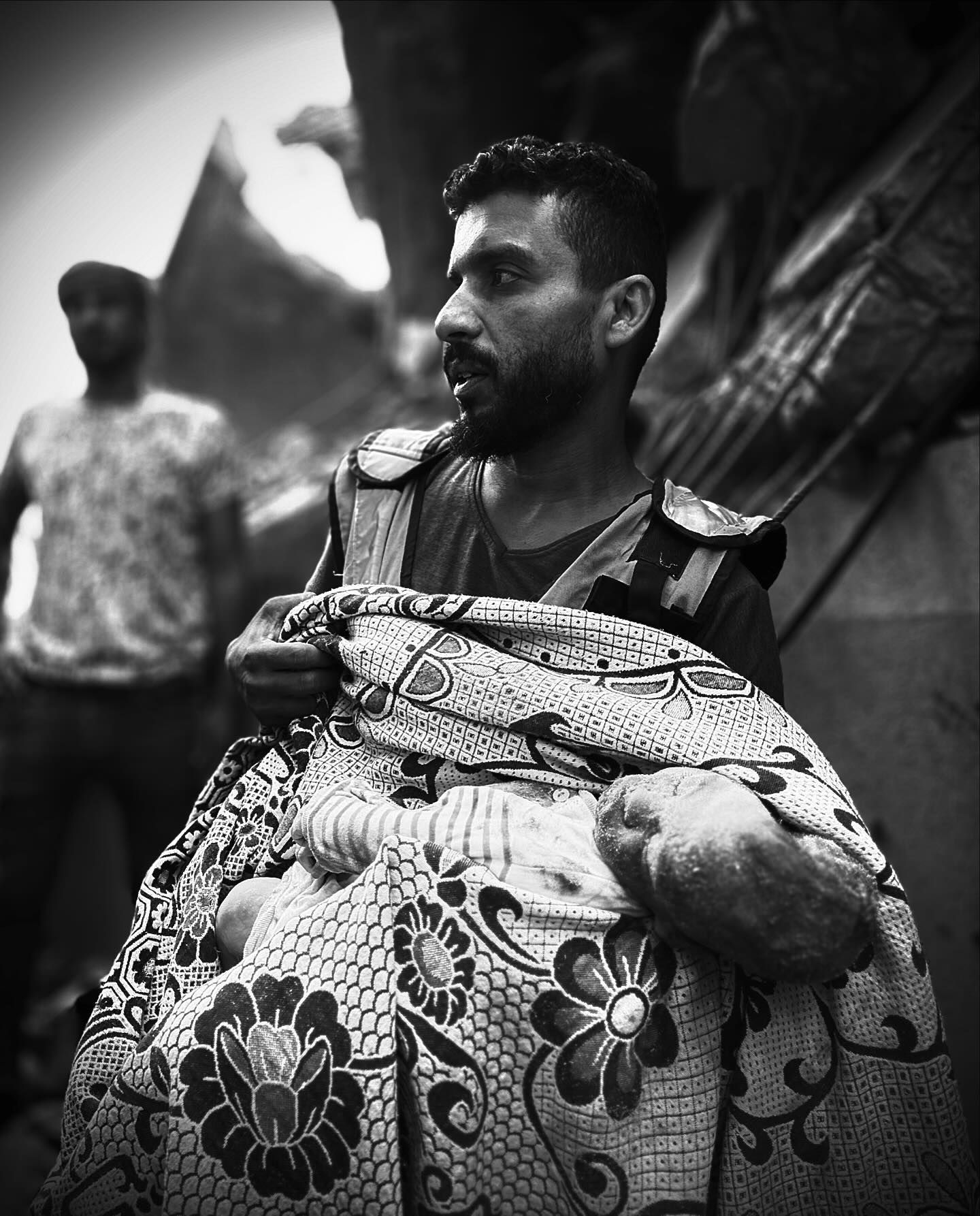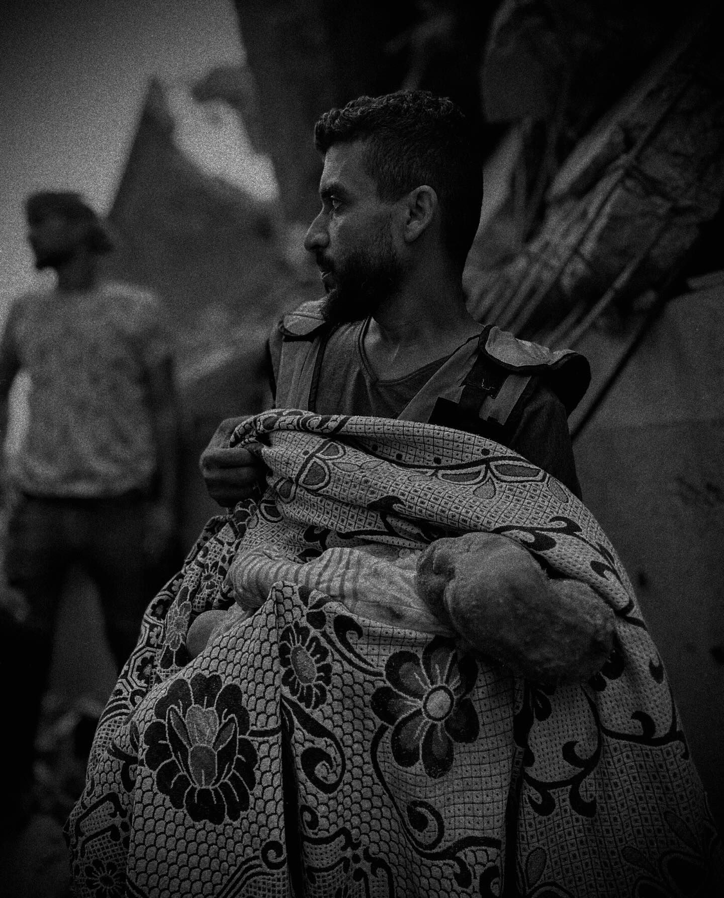Civil defense crews pull out the body of a baby from the rubble of a home that was bombed by Israeli warplanes in Khan Younis. By @badertabash انتشال جثمان رضيع من ركام منزل في خانيونس