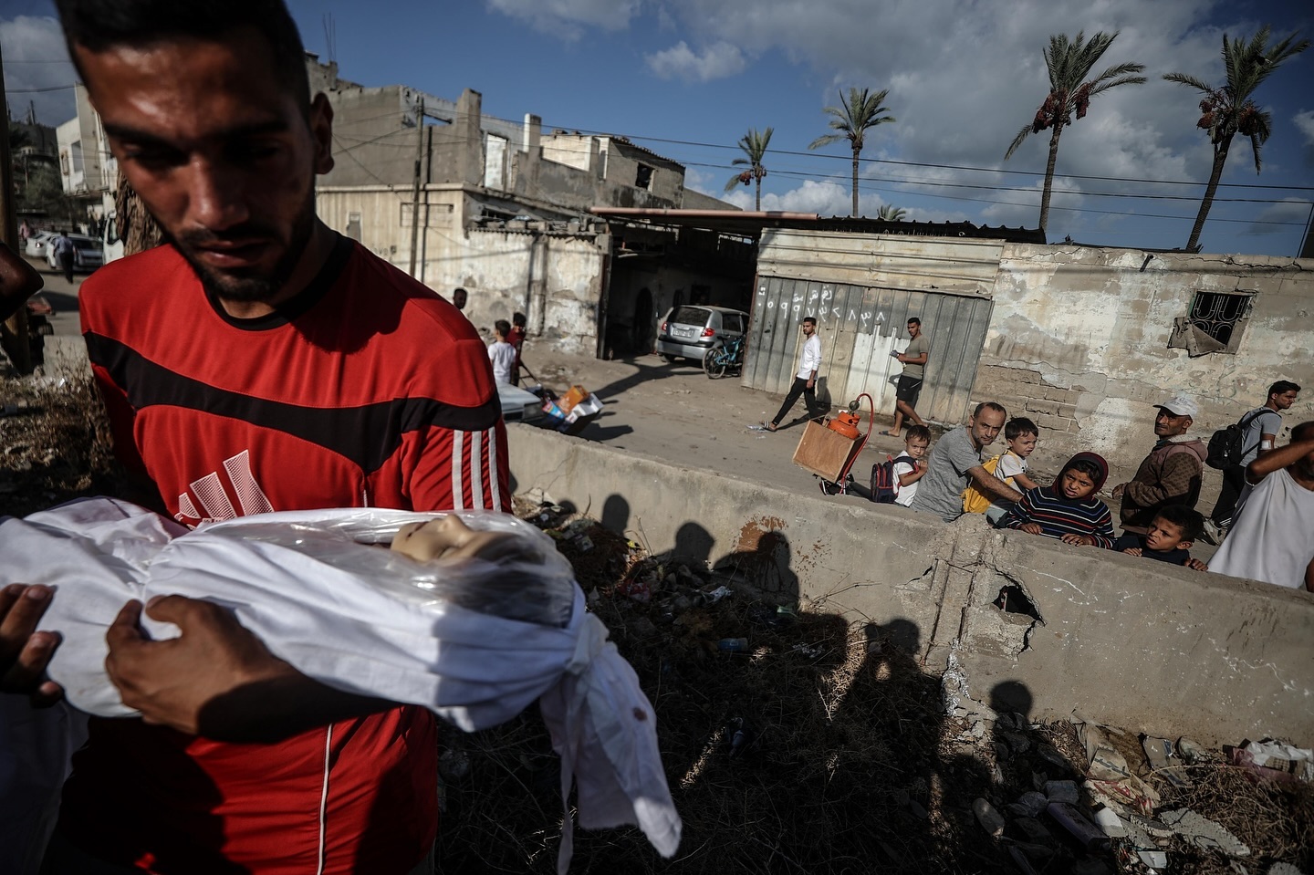 People attend the funeral ceremony of an 8-month-old baby girl named Jud Karim, who died in the attack in Nuseirat Refugee Camp in Deir Al Balah, Gaza on October 02, 2024. (Photo by Ali Jadallah/Anadolu via Getty Images)