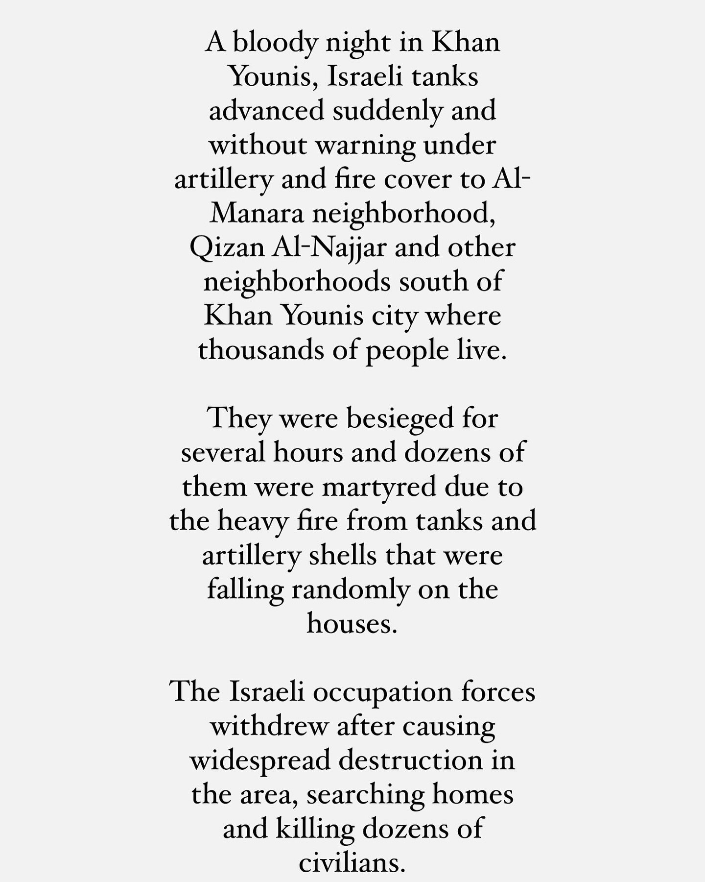 A bloody night in Khan Younis, Israeli tanks advanced suddenly and without warning under artillery and fire cover to Al-Manara neighborhood, Qizan Al-Najjar and other neighborhoods south of Khan Younis city where thousands of people live. They were besieged for several hours and dozens of them were martyred due to the heavy fire from tanks and artillery shells that were falling randomly on the houses. The Israeli occupation forces withdrew after causing widespread destruction in the area, searching homes and killing dozens of civilians.