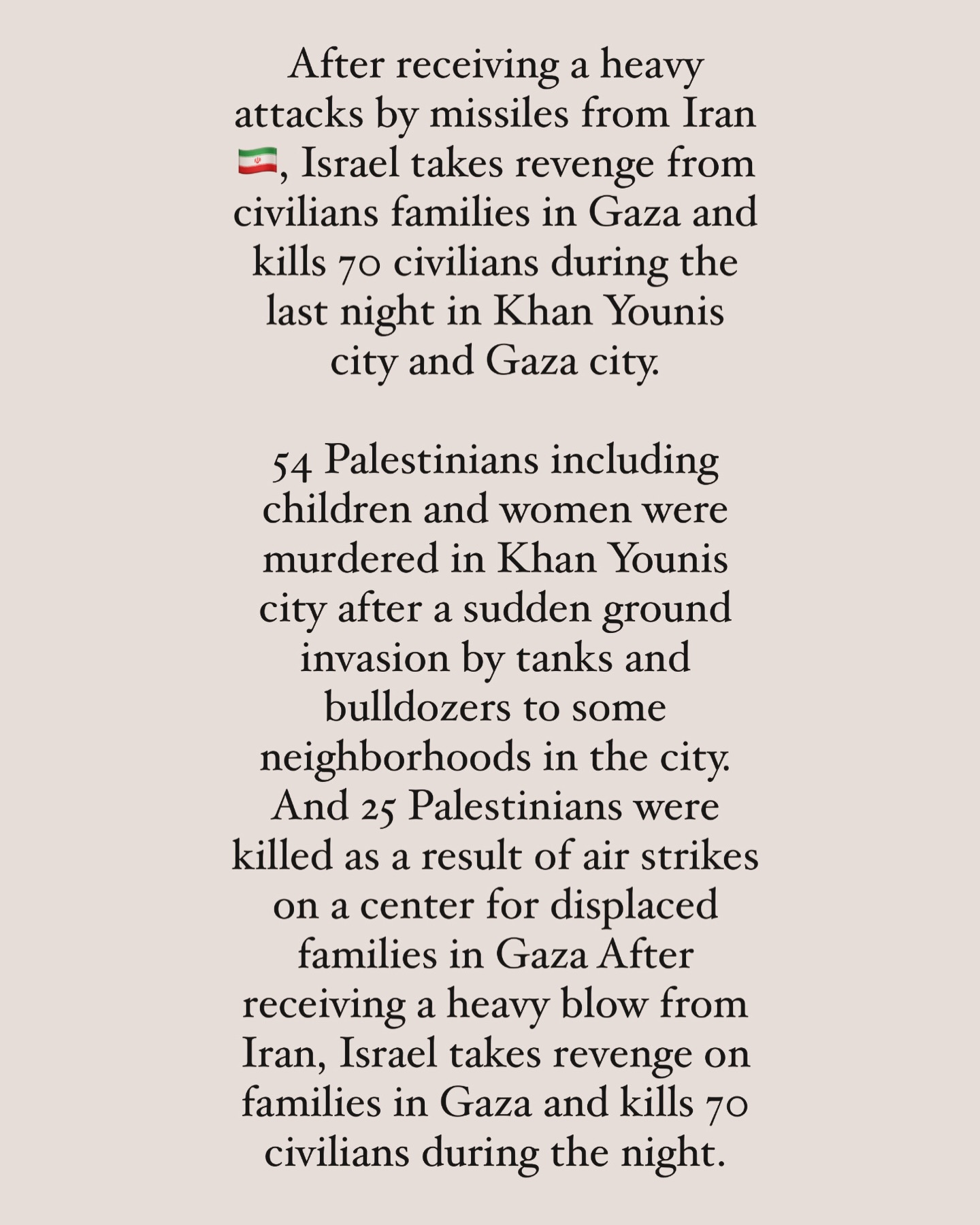 After receiving a heavy attacks by missiles from Iran 🇮🇷, Israel takes revenge from civilians families in Gaza and kills 70 civilians during the last night in Khan Younis city and Gaza city. 54 Palestinians including children and women were murdered in Khan Younis city after a sudden ground invasion by tanks and bulldozers to some neighborhoods in the city. And 25 Palestinians were killed as a result of air strikes on a center for displaced families in Gaza After receiving a heavy blow from Iran, Israel takes revenge on families in Gaza and kills 70 civilians during the night.