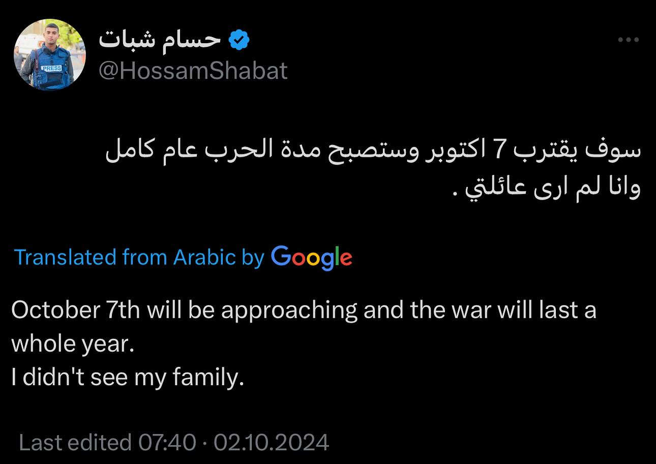 أنا هنــا، ولعــام كامل علــى الإبــادة، لا زلت شــاهدًا علــى الألــم والفقدان والجوع والدم والصمود. أنا مُرهق، لكــنني سأستمر في التغطية ونقل جرائم العدو. سأواصل إيصال الحقيقة لكــم.