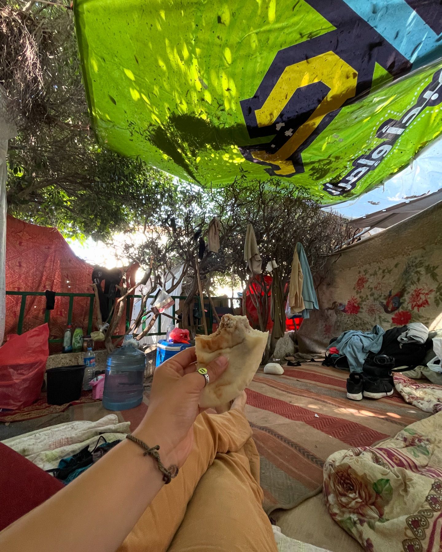 - The first picture is for my tent in the backyard of Shifa’a hospital, I remember my dad was searching for anything to cover us from the rain back in October 2023 and he found this billboard on the street, I lived here for 30 days - North Gaza.