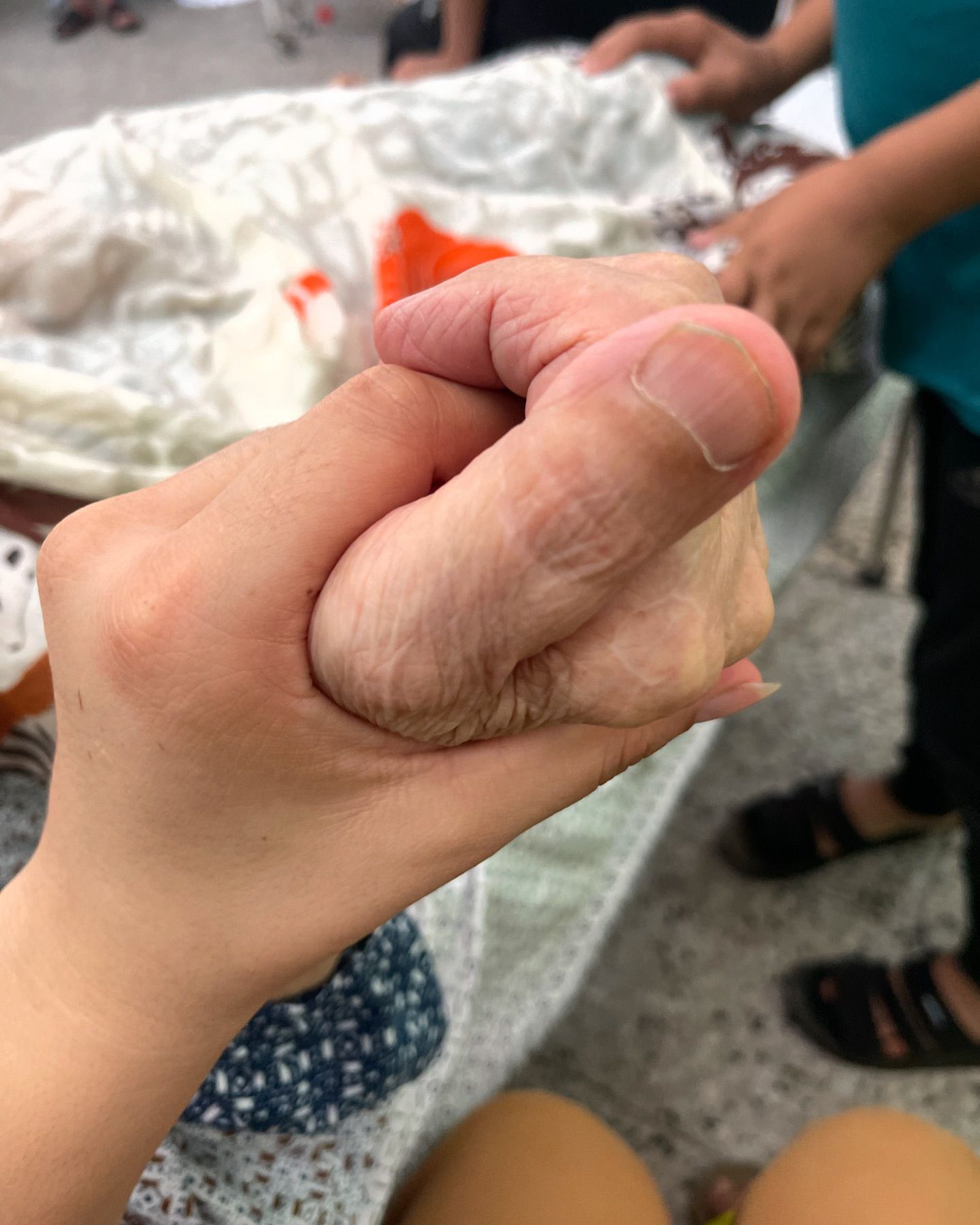 - fifth picture, the last time I touched my Grandma hand before she passed because of the poor health conditions and wide spread infections in Shifa’a hospital where we were displaced with 60,000 other displaced people.