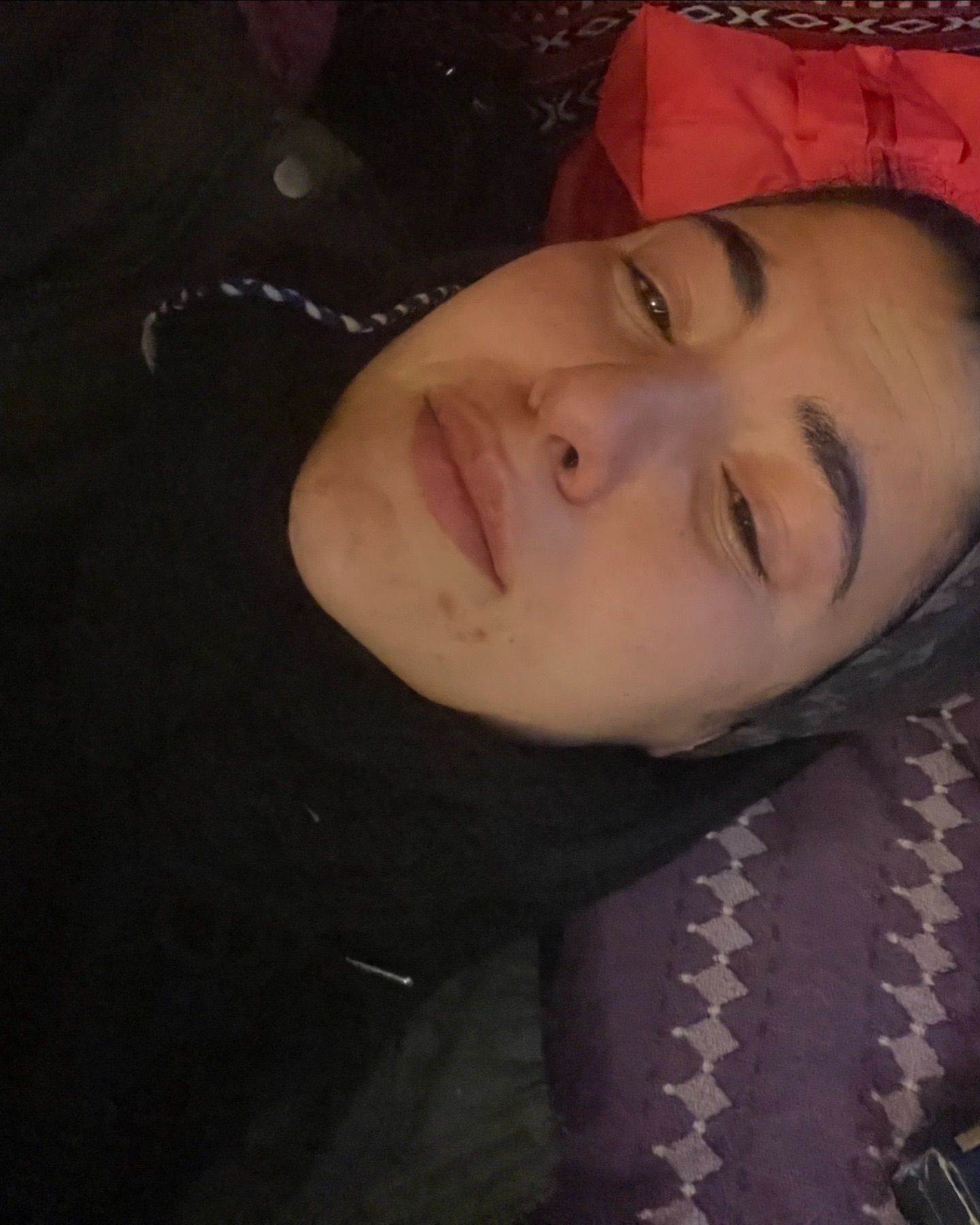 Fifth picture is after crying almost for 4 hours nonstop after I knew my home in the north of Gaza Strip is bombed/ destroyed while I am displaced in a tent in the south of Gaza Strip.