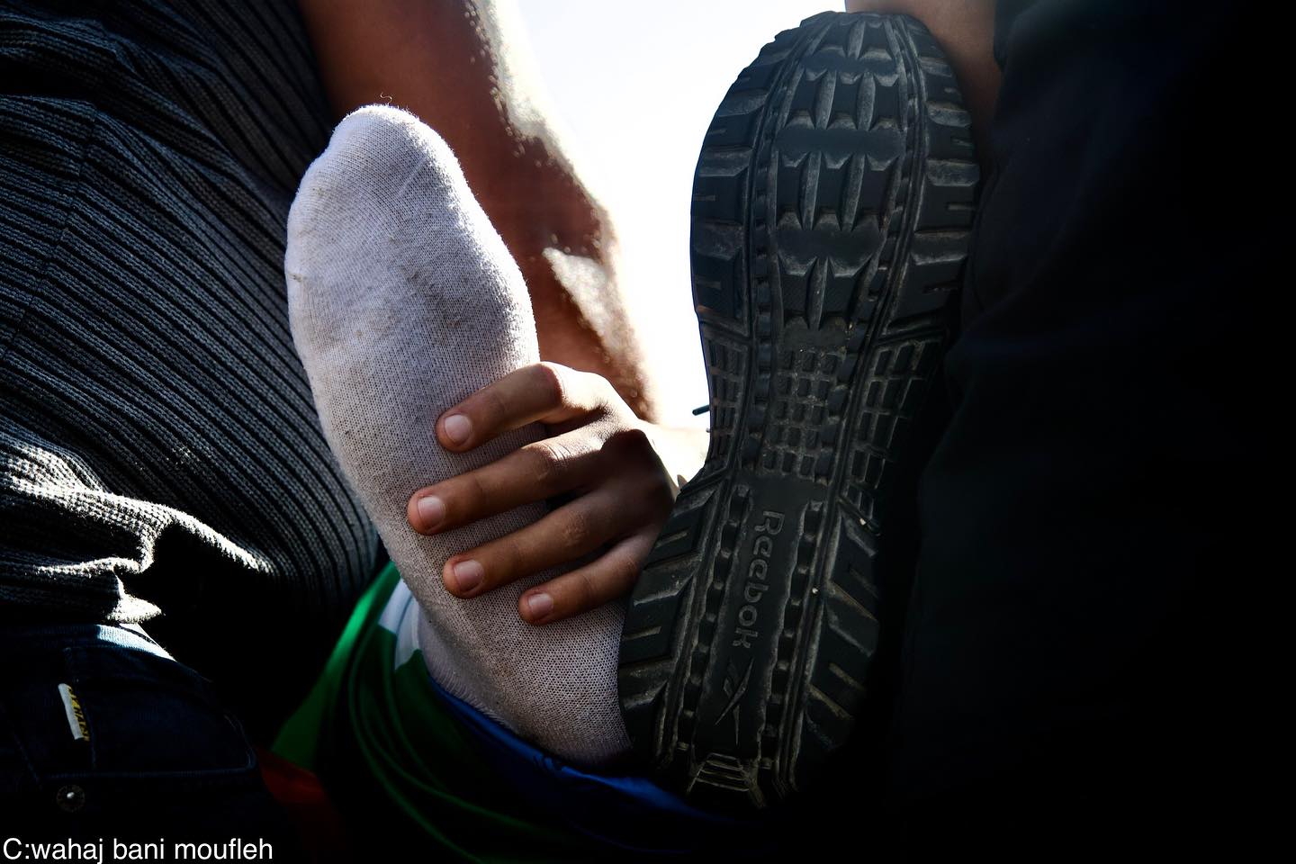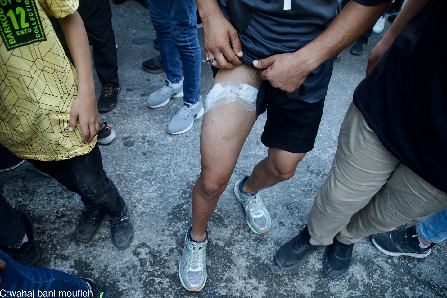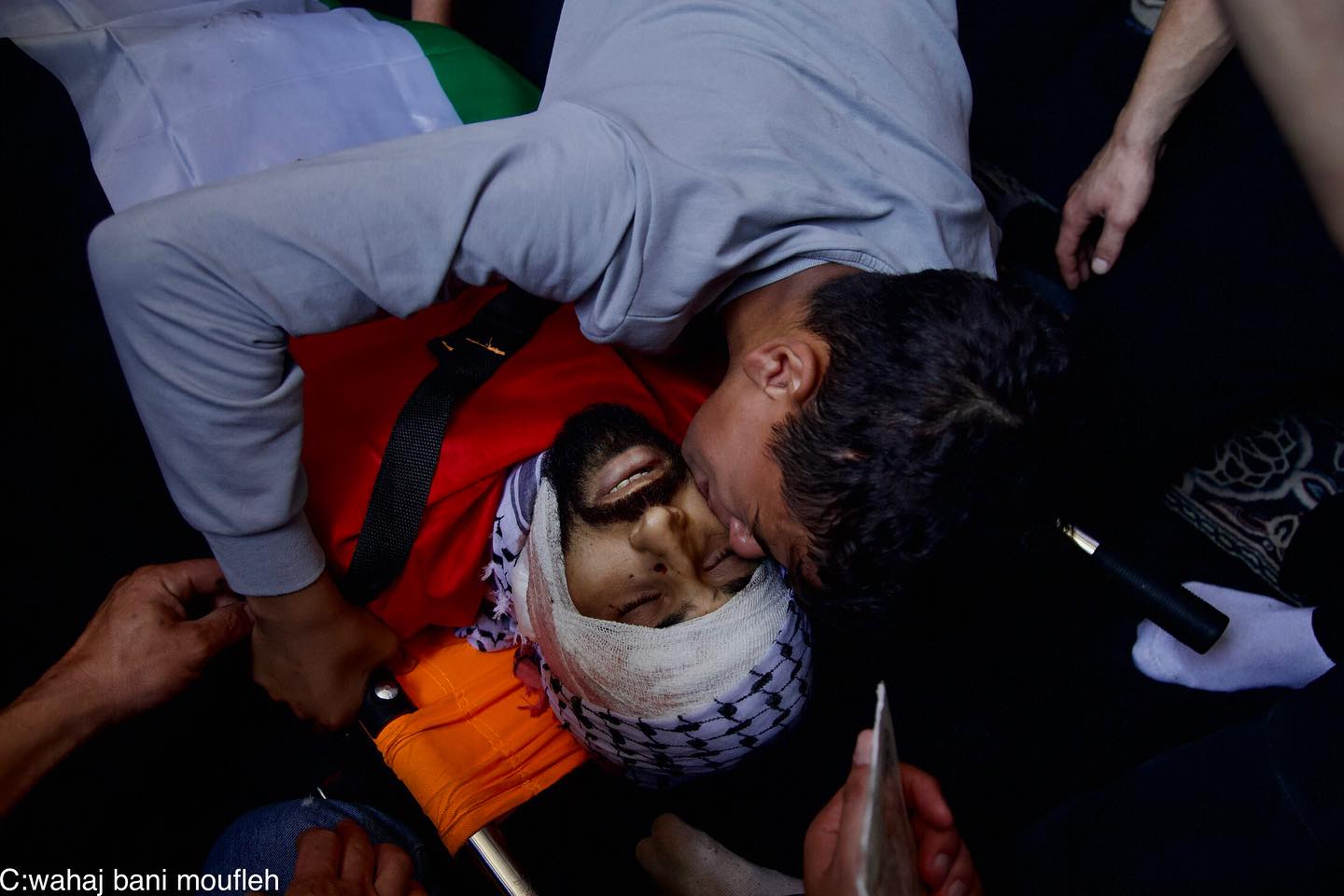 The first moment of sniping the journalist @fadi_alwhidi by Israeli sniper fires northern of Gaza Strip while he was covering the events on the ground there. Fadi was wearing the press jacket and despite this he was sniped, fadi now is critically wounded pray for him.