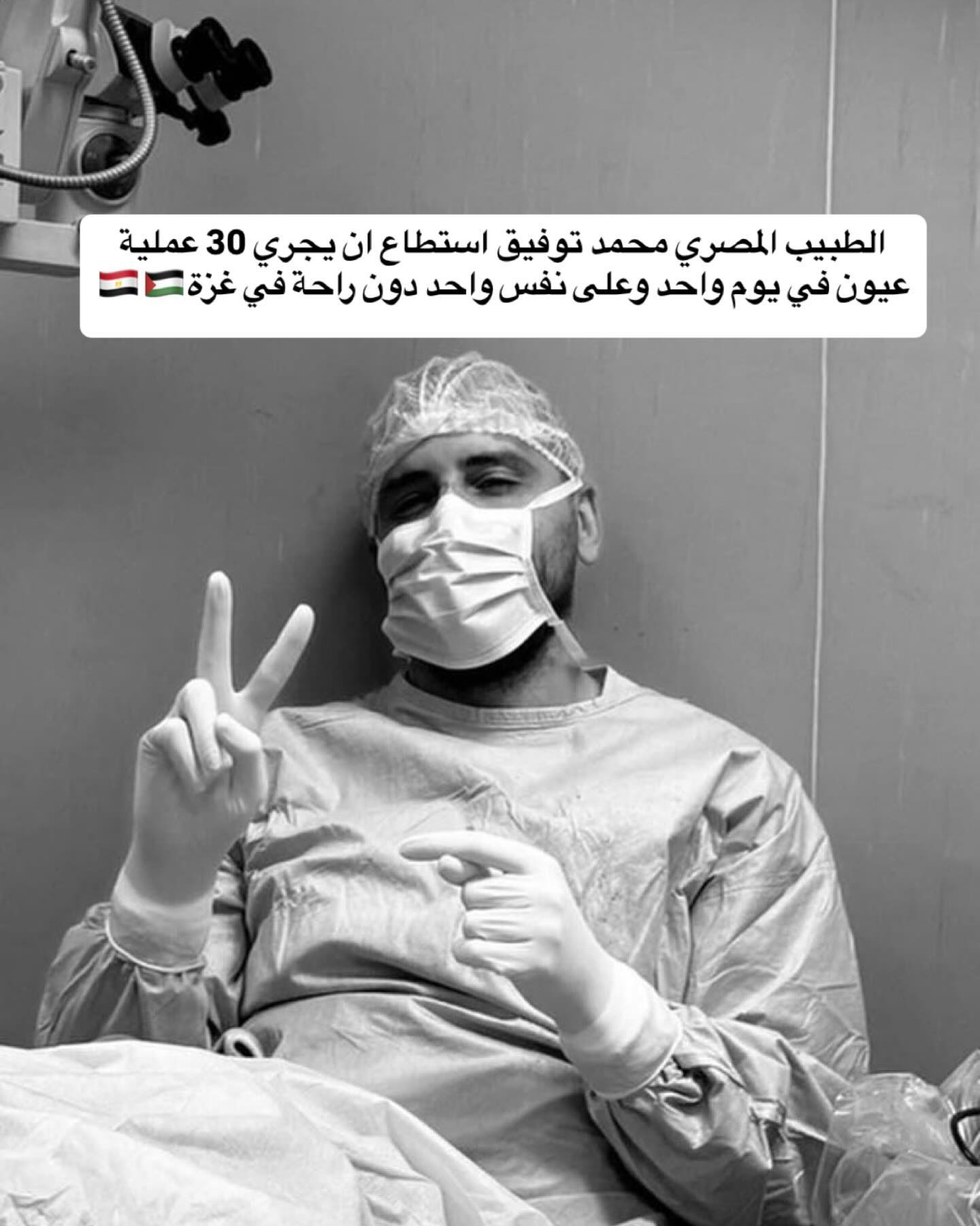 الطبيب المصري محمد توفيق استطاع ان يجري 30 عملية عيون في يوم واحد وعلى نفس واحد دون راحة في غزة هذا الطبيب المصري ، لم يرق له أن يجلس كما البقية متفرجاً، بل خاطر بحياته وجاء غزة رغم استحالة الأمر وخطورة الوضع، ليضمد جراح أهلها، ويخفف عنها مصابها دخل غزة يسابق الزمن حتى استطاع أن يجري أكثر من ثلاثين عملية عيون في يوم واحد، وعلى نفس واحد بلا راحة أو أدنى استراحة !! هؤلاء هم فخر العرب الحقيقيون الذين لهم منا كل حب وتقدير وامتنان