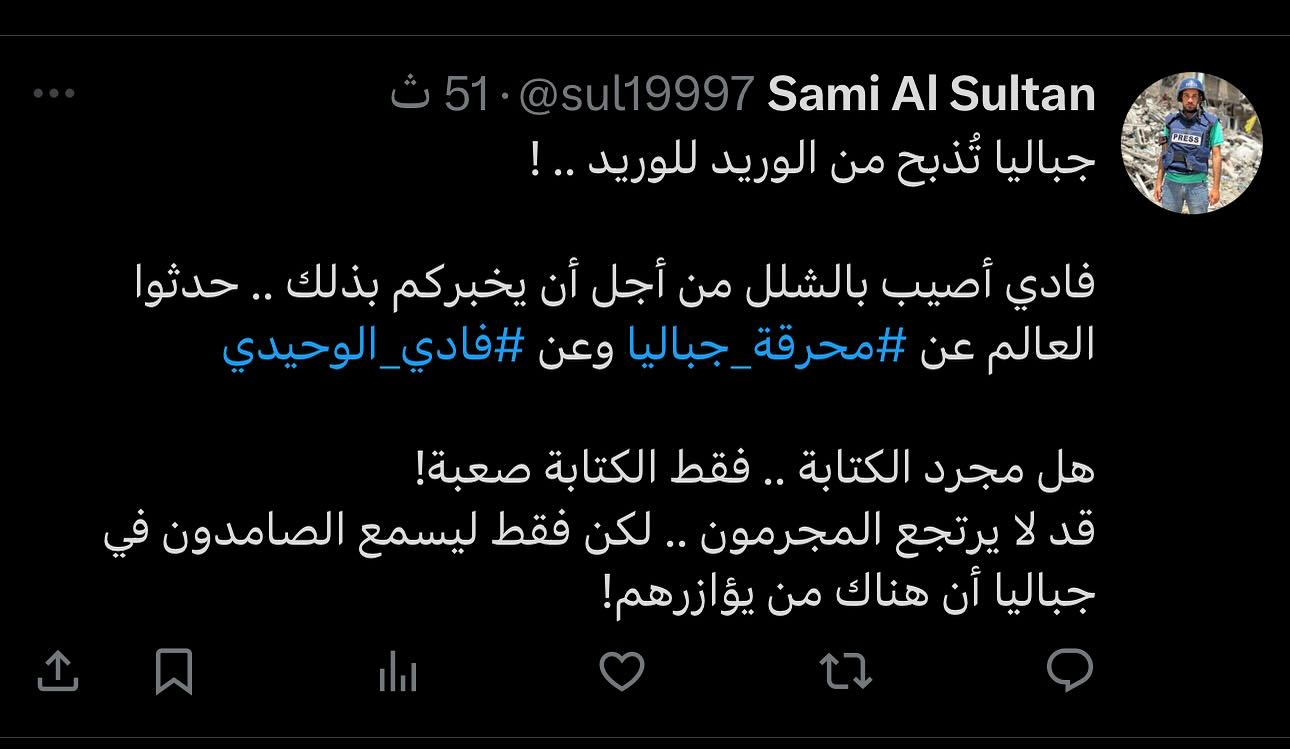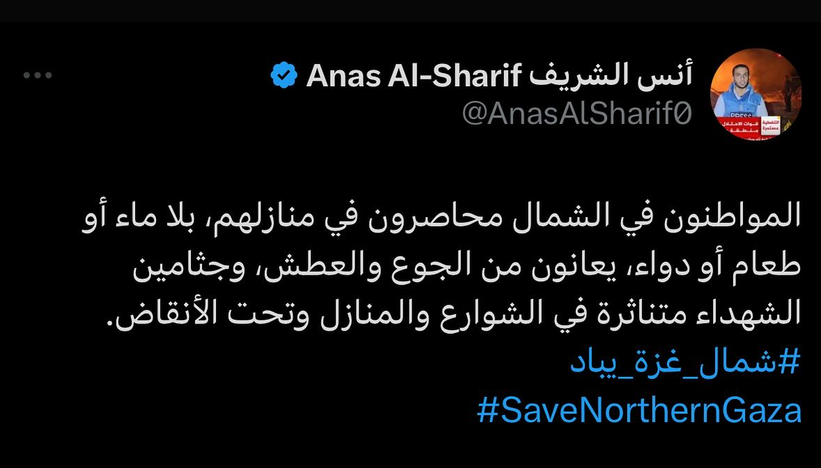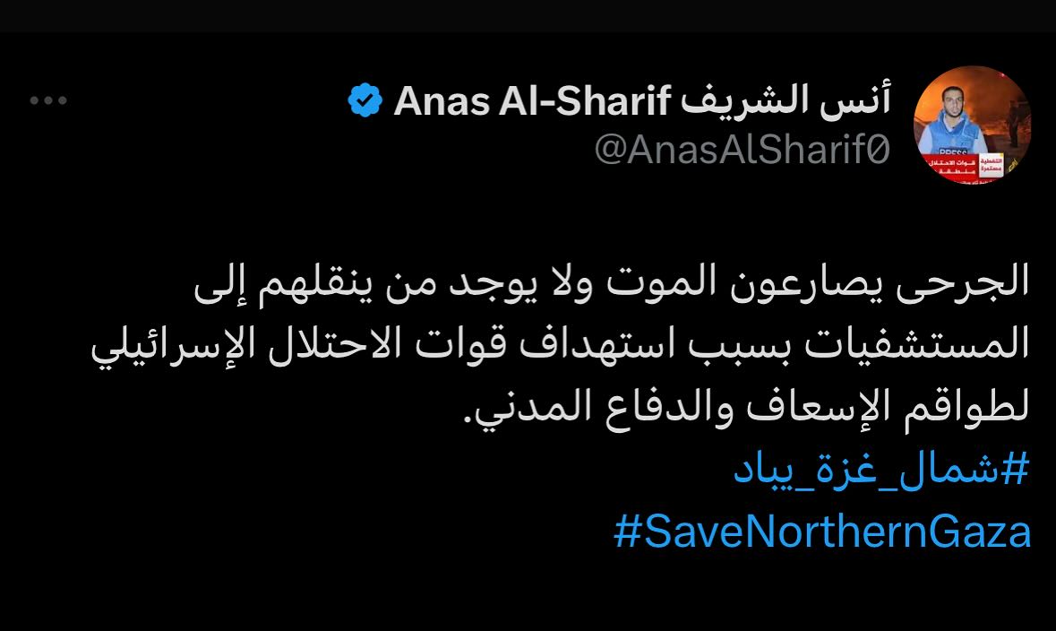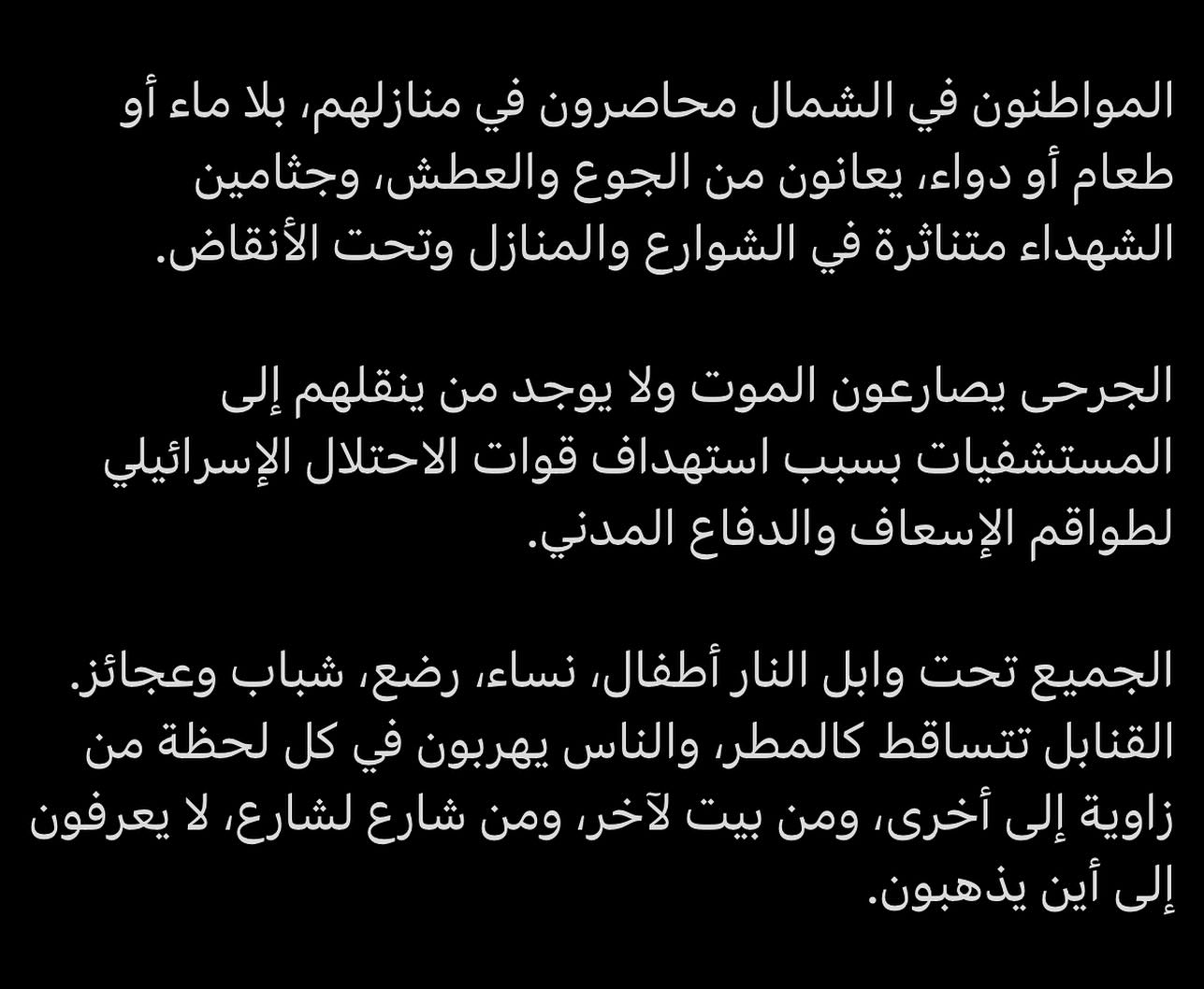 المواطنون في الشمال محاصرون في منازلهم، بلا ماء أو طعام أو دواء، يعانون من الجوع والعطش، وجثامين الشهداء متناثرة في الشوارع والمنازل وتحت الأنقاض. #شمال_غزة_يباد #SaveNorthernGaza