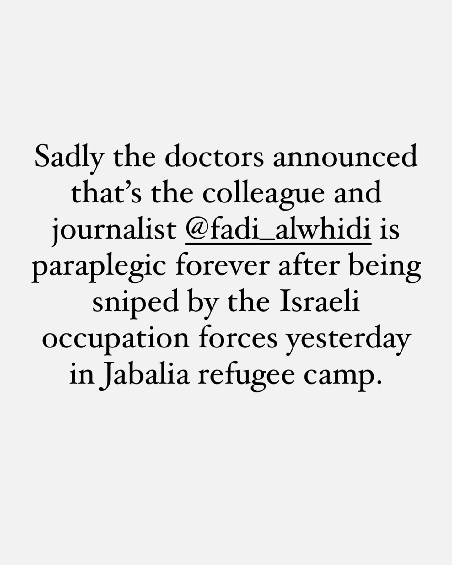 للأسف لم ينج الصديق فادي من الشلل! استهدف الجيش الإسرائيلي الصحفي فادي الوحيدي برصاصة أصابت النخاع الشوكي، مع كسر انفجاري في الفقرة الصدرية الأولى. وجعنا عليك كبير يا فادي.. الله غالب حبيبي يافادي قلبي عندك @fadi_alwhidi Unfortunately, our friend Fadi did not escape paralysis! The Israeli army targeted journalist Fadi Al-Wahidi with a bullet that hit the spinal cord, with an explosive fracture in the first thoracic vertebra. Our pain is great for you, Fadi.. God is victorious