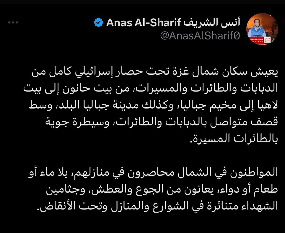 يعيش سكان شمال غزة تحت حصار إسرائيلي كامل من الدبابات والطائرات والمسيرات، من بيت حانون إلى بيت لاهيا إلى مخيم جباليا، وكذلك مدينة جباليا البلد، وسط قصف متواصل بالدبابات والطائرات، وسيطرة جوية بالطائرات المسيرة. المواطنون في الشمال محاصرون في منازلهم، بلا ماء أو طعام أو دواء، يعانون من الجوع والعطش، وجثامين الشهداء متناثرة في الشوارع والمنازل وتحت الأنقاض. الجرحى يصارعون الموت ولا يوجد من ينقلهم إلى المستشفيات بسبب استهداف قوات الاحتلال الإسرائيلي لطواقم الإسعاف والدفاع المدني. الجميع تحت وابل النار أطفال، نساء، رضع، شباب وعجائز. القنابل تتساقط كالمطر، والناس يهربون في كل لحظة من زاوية إلى أخرى، ومن بيت لآخر، ومن شارع لشارع، لا يعرفون إلى أين يذهبون.