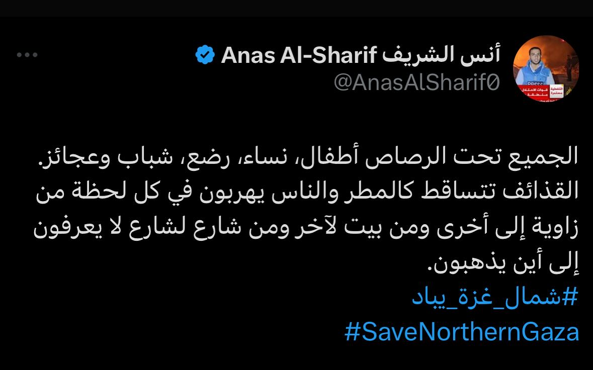 الجميع تحت الرصاص أطفال، نساء، رضع، شباب وعجائز. القذائف تتساقط كالمطر والناس يهربون في كل لحظة من زاوية إلى أخرى ومن بيت لآخر ومن شارع لشارع لا يعرفون إلى أين يذهبون. #شمال_غزة_يباد #SaveNorthernGaz