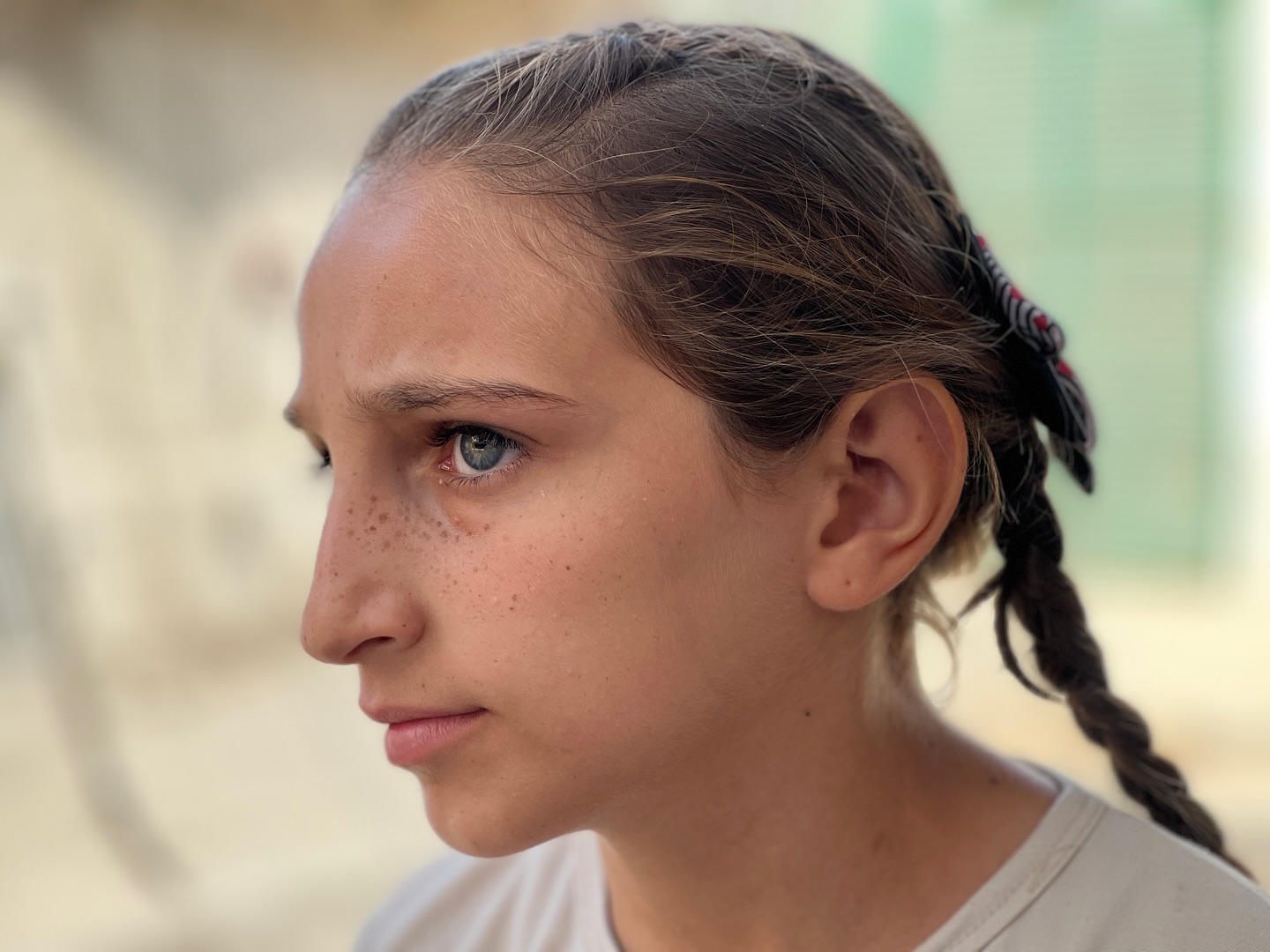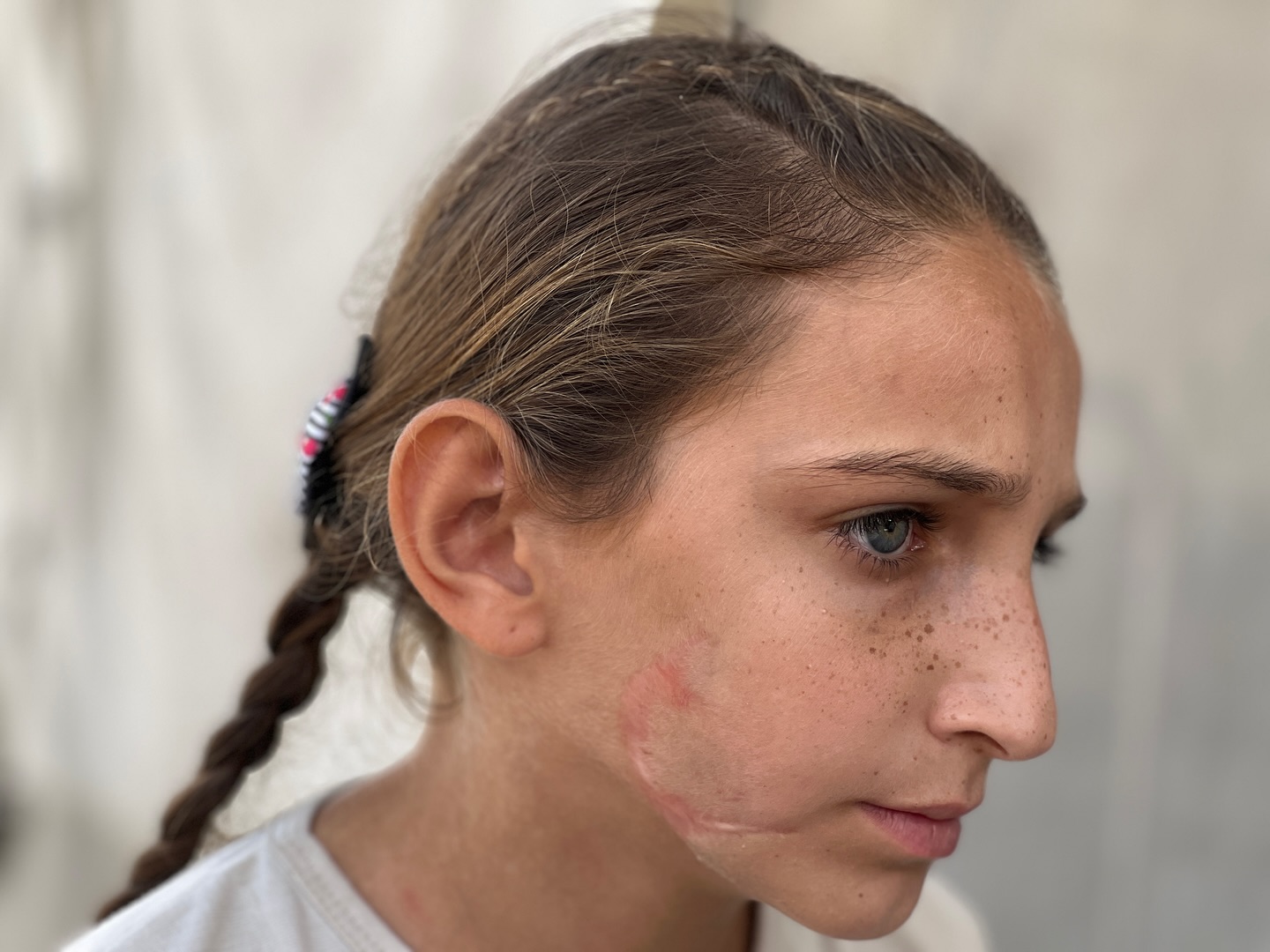 The 12-year-old girl, Sama Al-Thalathini, was injured in her face and other parts of her body as a result of an Israeli bombing of a house to which she and her family had fled in Khan Younis. She lost two brothers, one of whom was the journalist Mohammed and his family, while her mother was injured in addition to a stroke after learning of the death of her children.