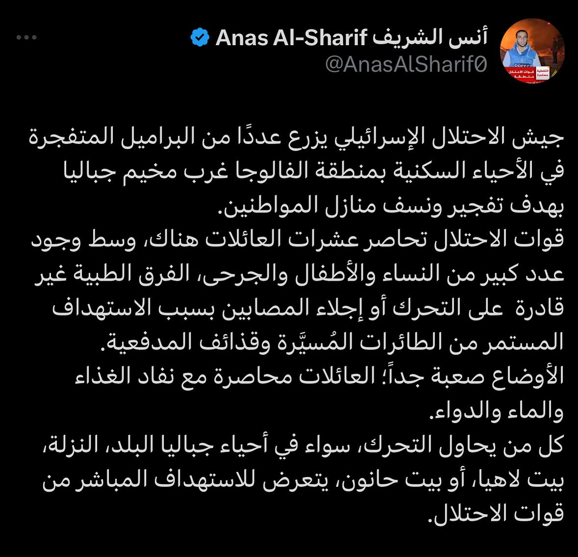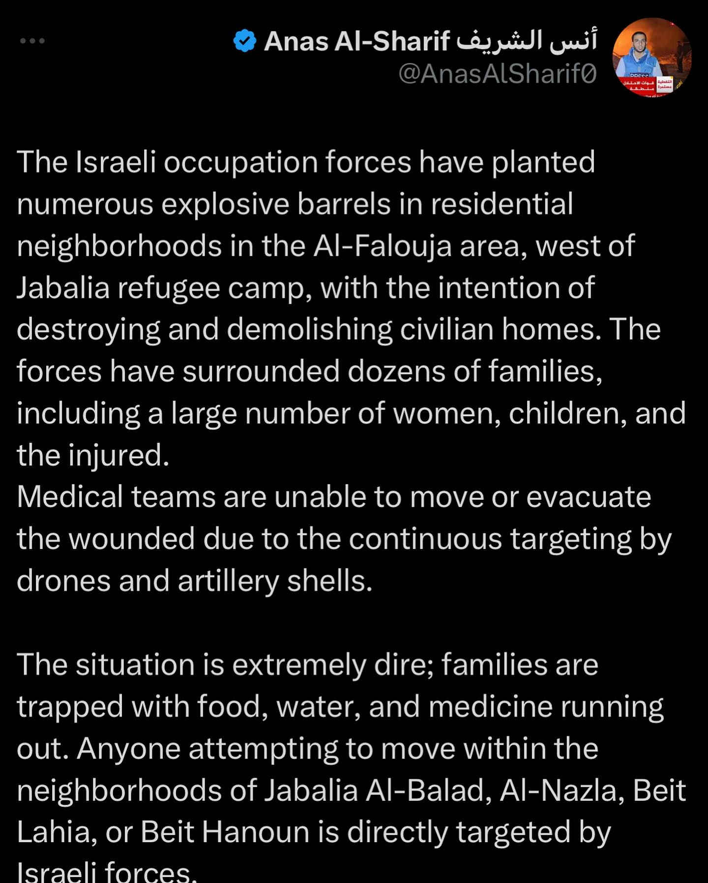 The situation is extremely dire; families are trapped with food, water, and medicine running out. Anyone attempting to move within the neighborhoods of Jabalia Al-Balad, Al-Nazla, Beit Lahia, or Beit Hanoun is directly targeted by Israeli forces.