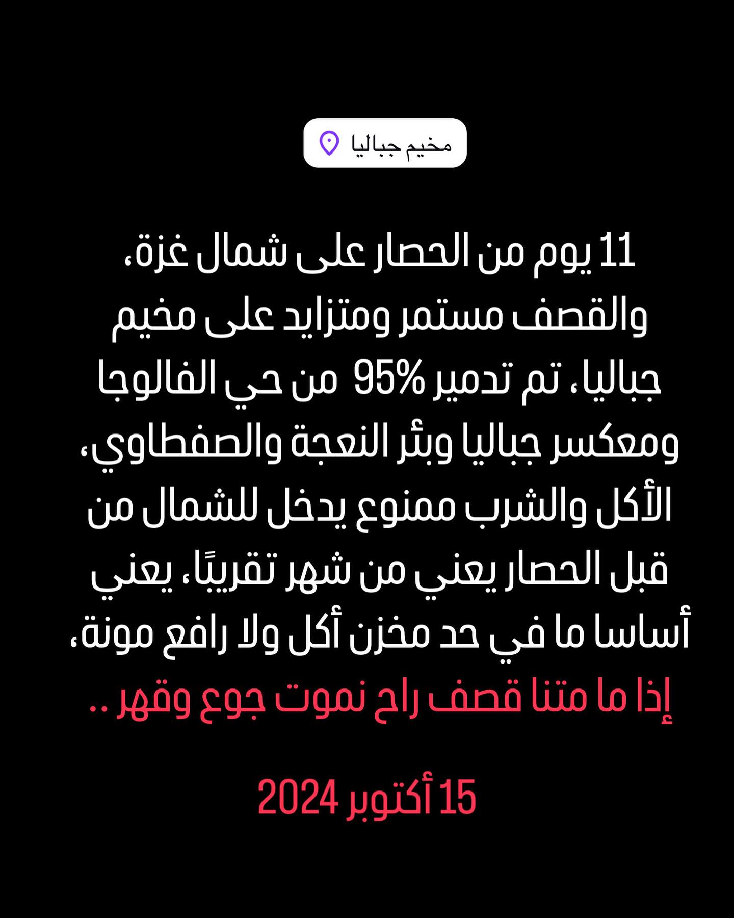 اليوم ال11 لحصار الشمال، منذ ساعات الليل الأولى وحتى اللحظة يتم قصفنا وإبادتنا وتجويعنا، ليلة قاسية مليئة بالنسف والتدمير والقتل . لا ضمير لهذه الأمة لا أحد يتحرك لأجلنا ولأجل قضية الإنسانية .