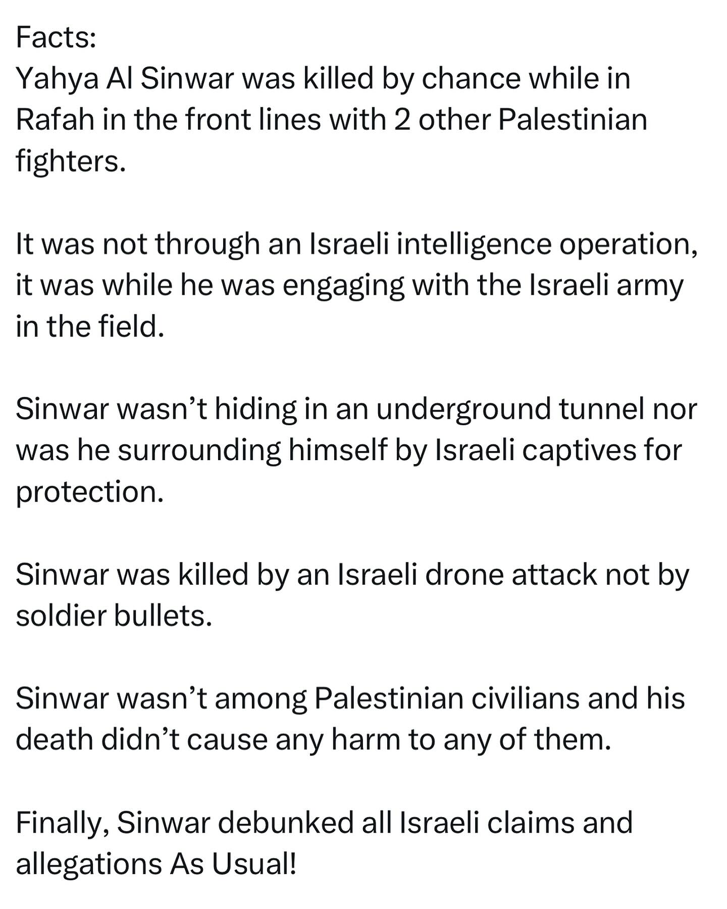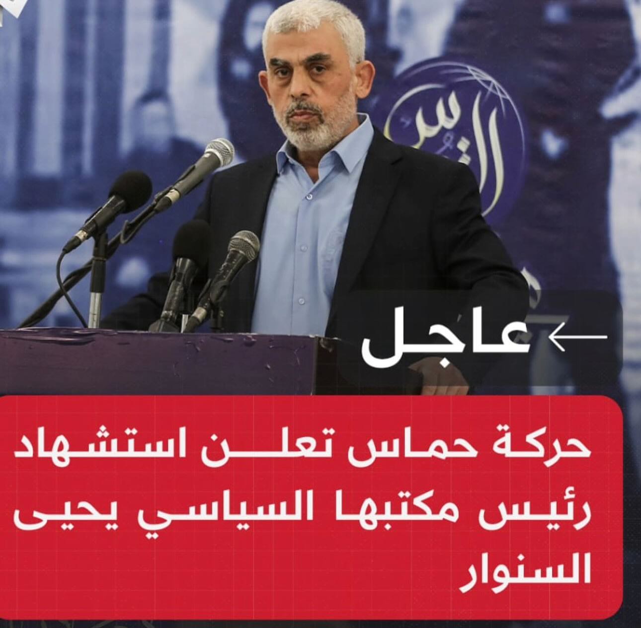 Hamas officially announced the martyrdom of Yahya Sinwar. The Israeli occupation forces killed Hamas leader “Yahya Sinwar”in Rafah city southern of Gaza Strip. The leader Yahya Sinwar is seen wearing his military uniform, where he was killed during a clash with the IOF not as they claims that’s he was hiding in tunnels and take the hostages as a human shield!. the building he was in was bombed and he was martyred along with a number of other resistance leaders. Long Live resistance. Glory for martyrs.