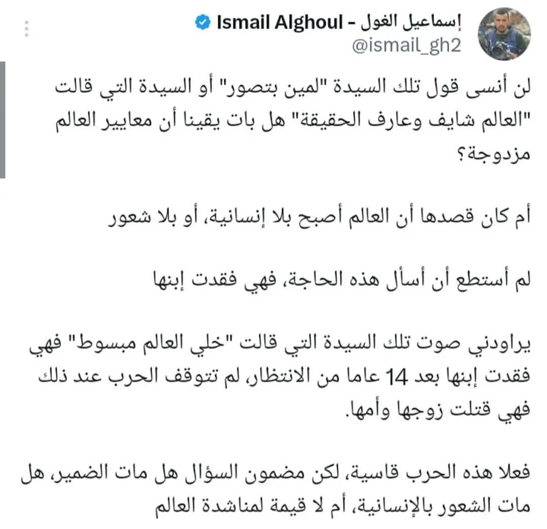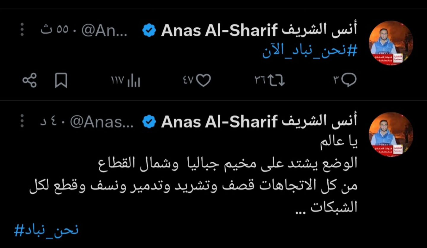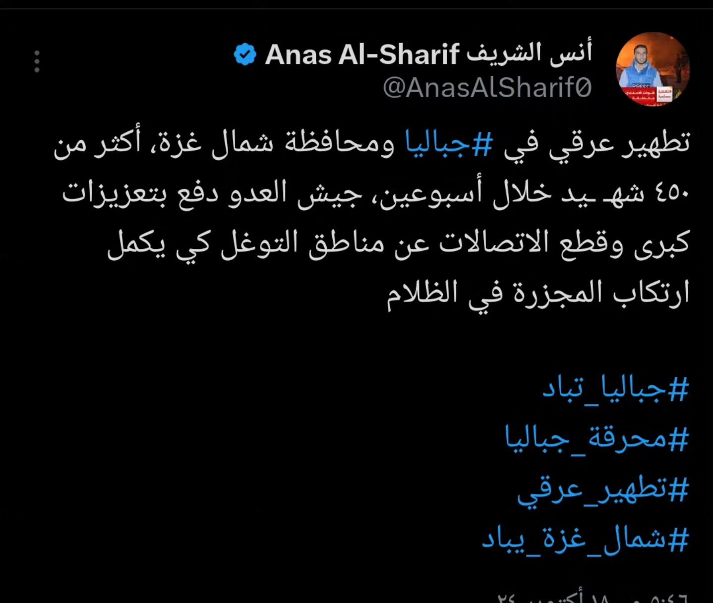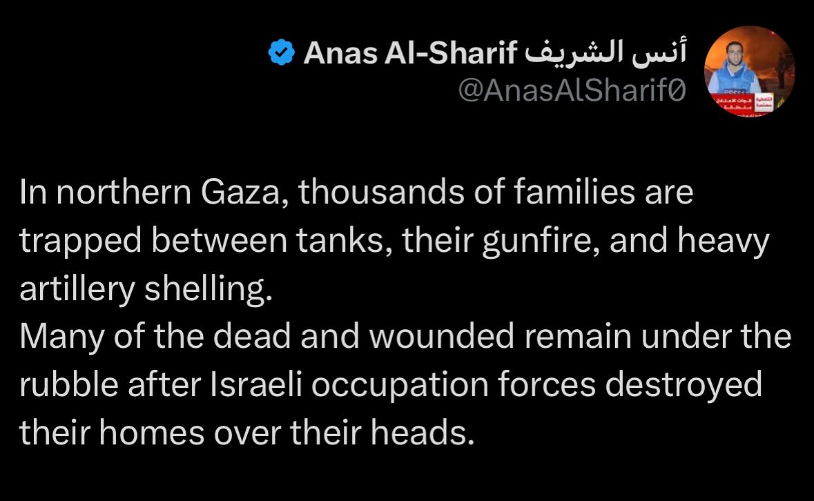 The horrors of the end of the world have been happening for two weeks in northern Gaza! If you are human, tell those around you about us. Fill the world with noise and raise your voices to speak about us. Do not let us die in silence. Do not get used to the scene, and do not stand by idly; for neutrality is betrayal! أهوال نهاية العالم تحدُث مُنذ أسبوعين في شمال #غزة! إنْ كُنت إنسانًا؛ أخبِر مَن حَولَك عنّا، إملؤا العالم ضجيجًا وارفعوا أصواتكم بالحديث عنّا، ولا تتركونا نموُت وَحدنا بصمت. لا تعتادوا المشهَد، ولا تقِفوا على الحِيَاد؛ فالحِيَادُ خيانة!