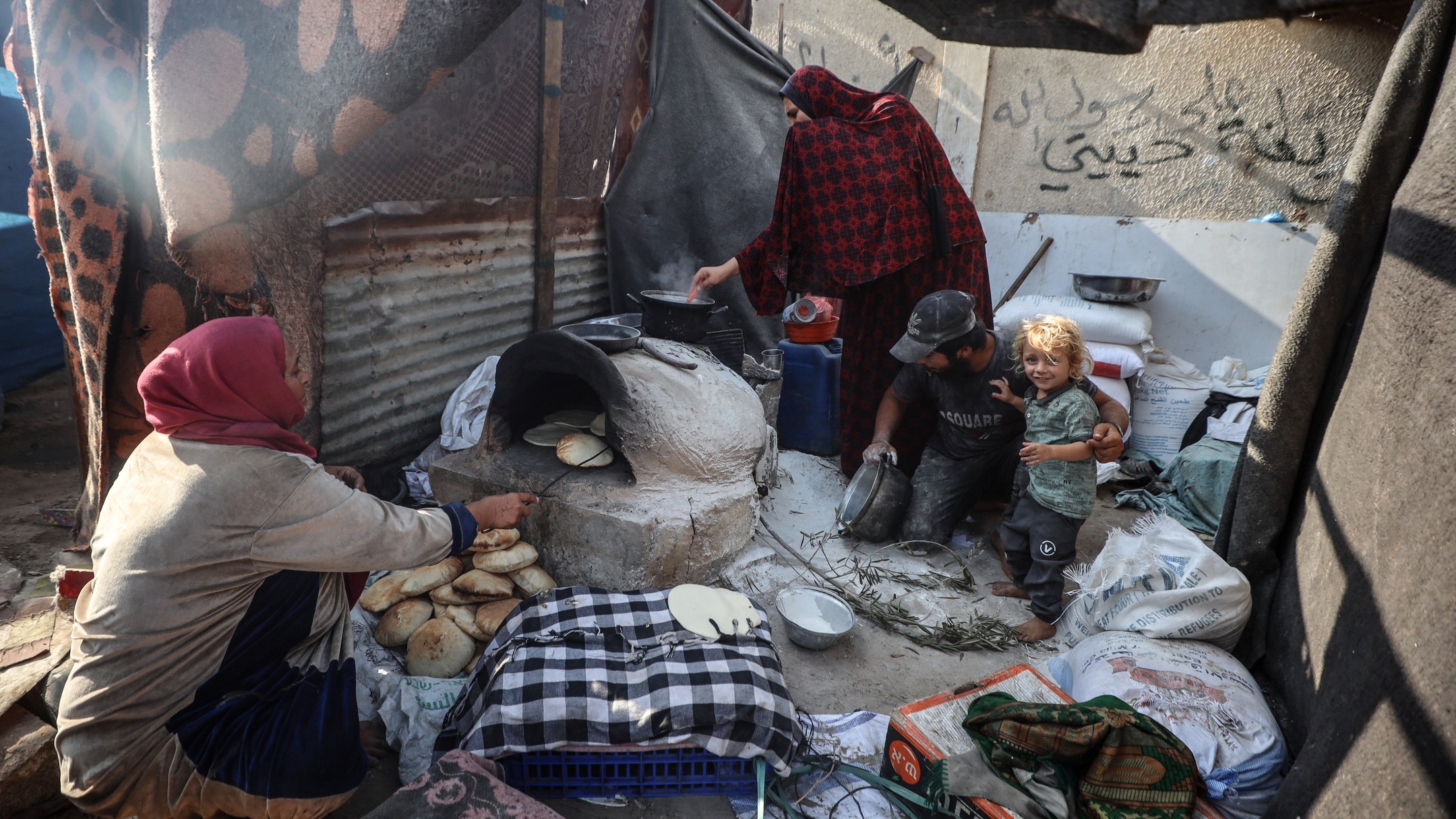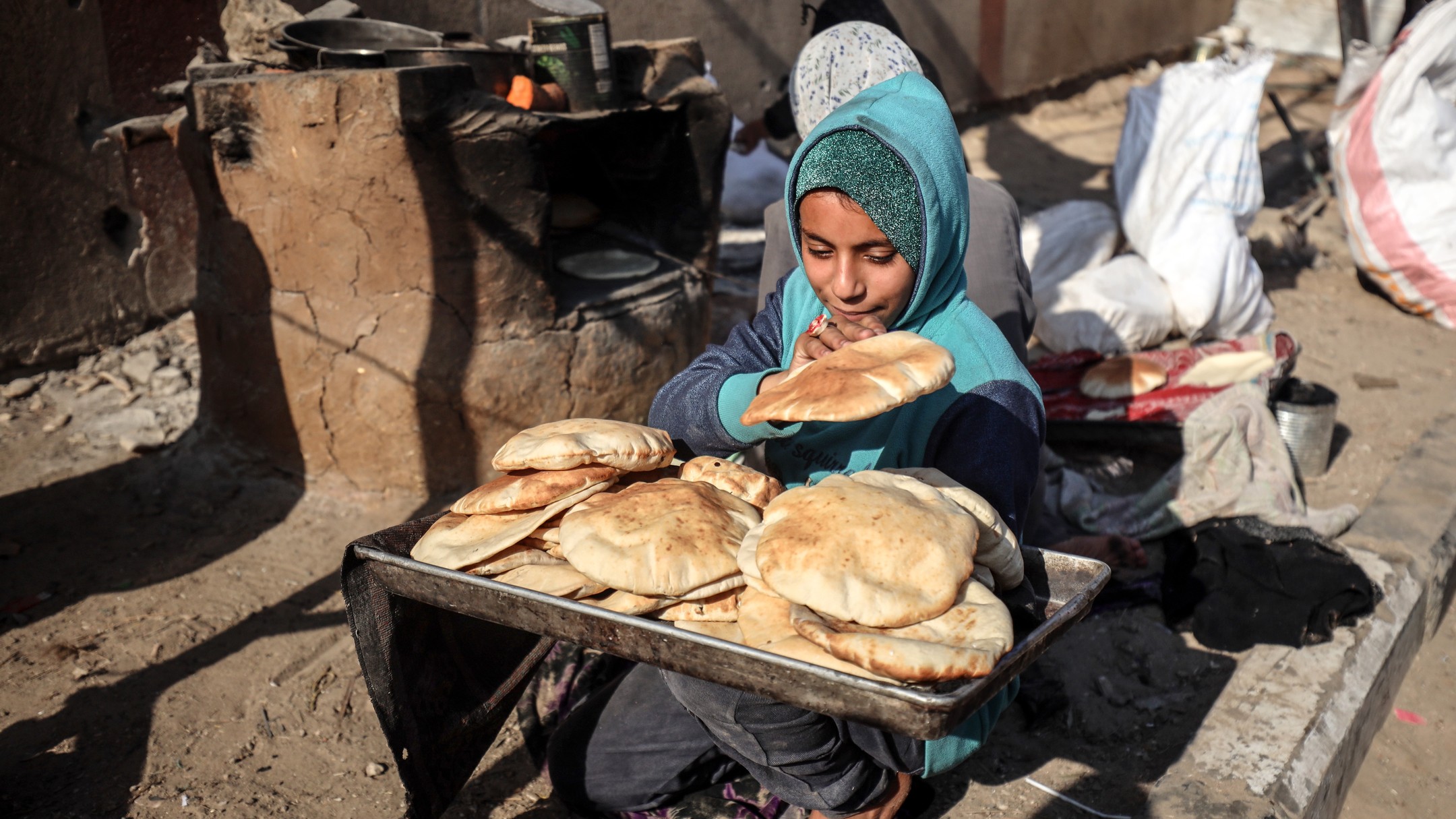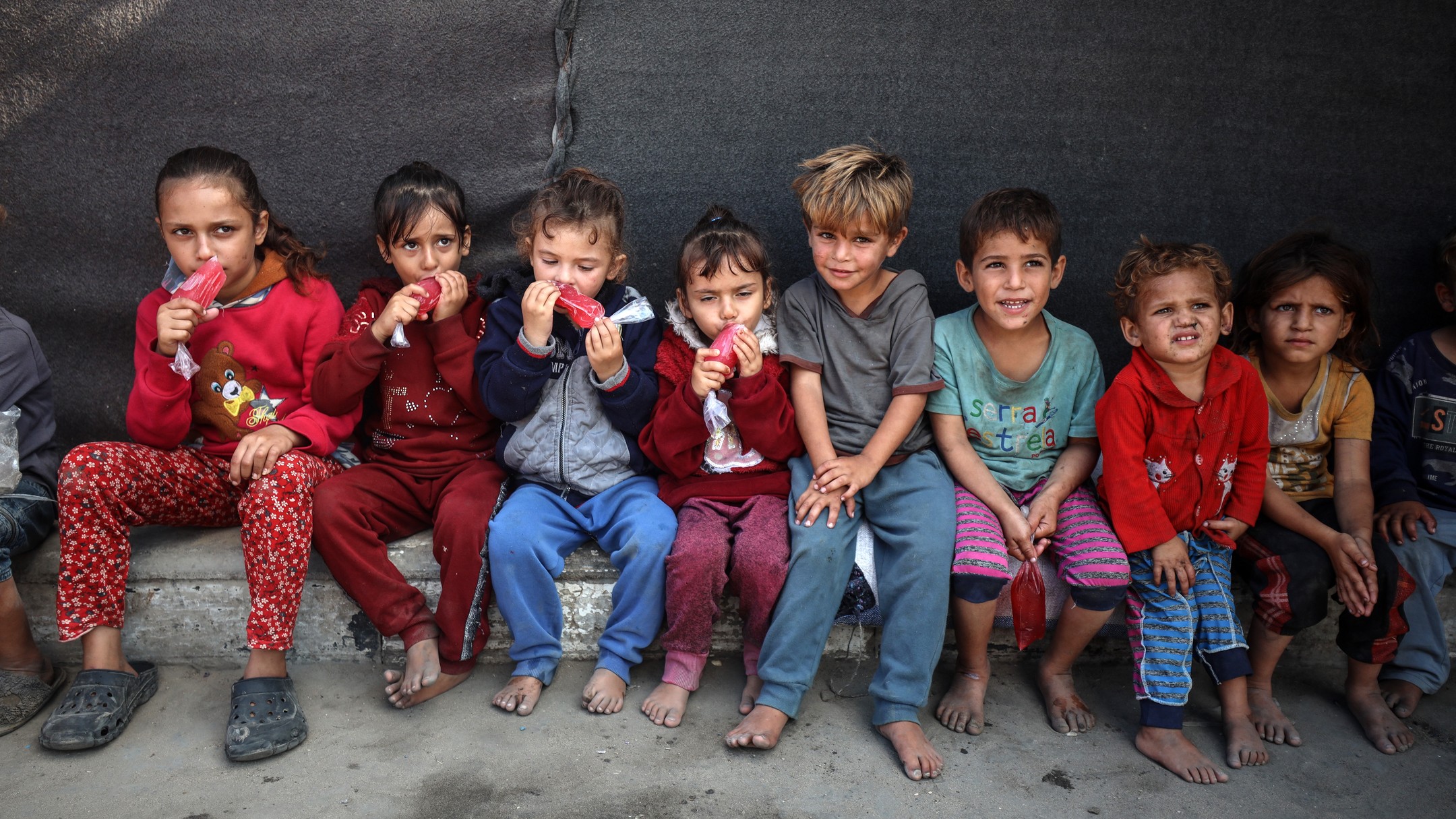 أطفال ينتظرون دورهم للحصول على بعض الطعام في خانيونس. Children wait their turn to get some food in Khan Younis.