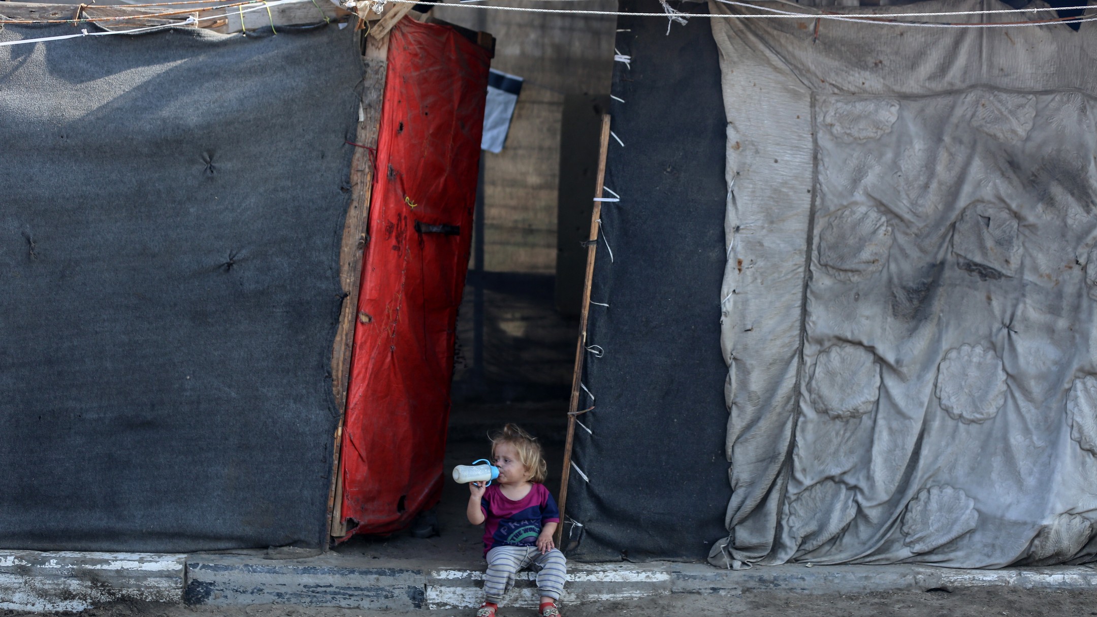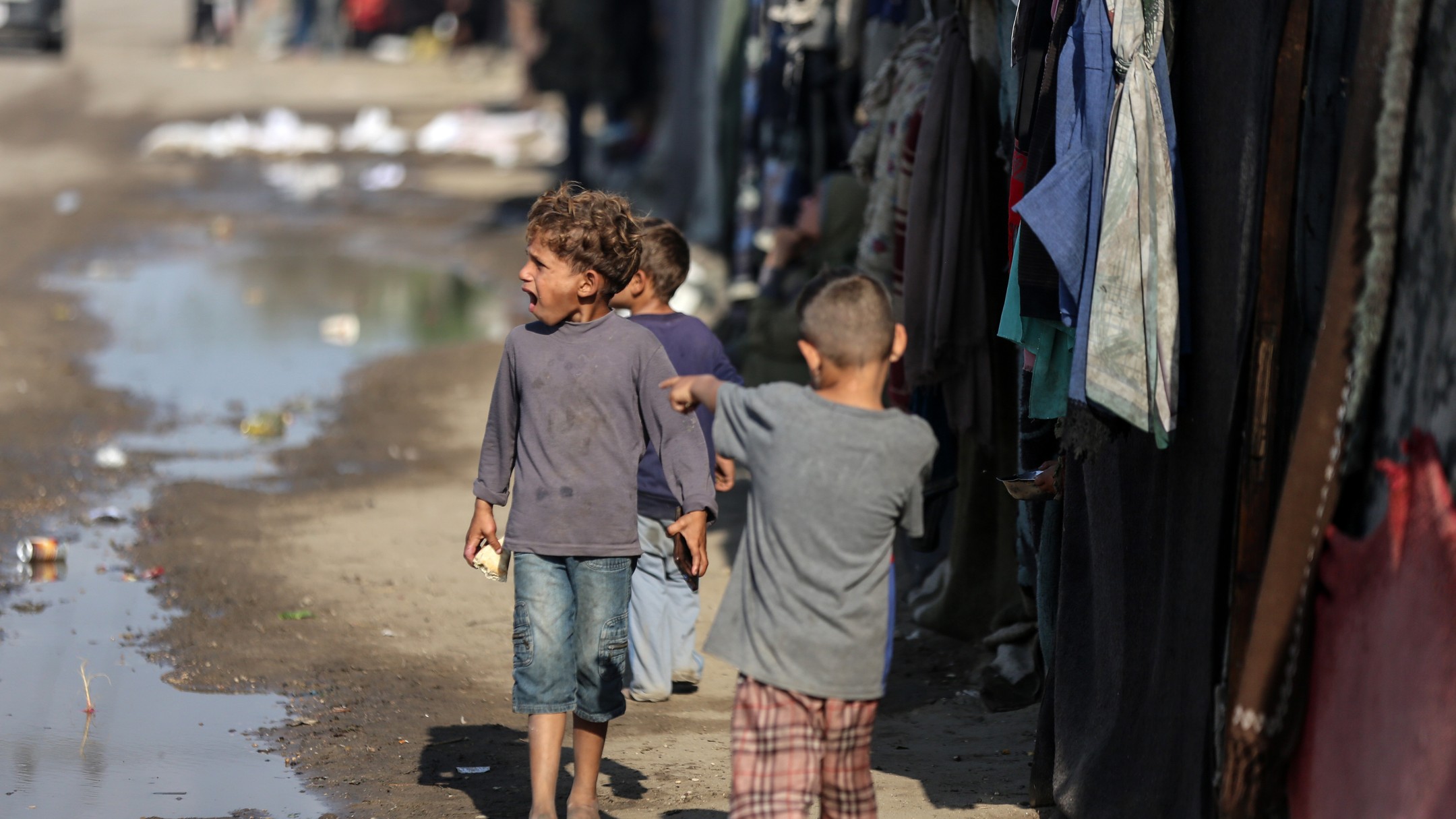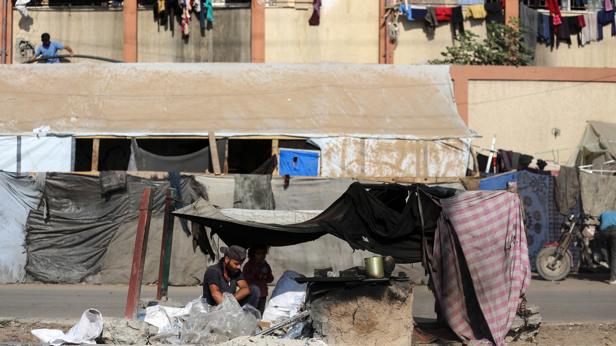 Displaced Palestinian children sit in front of a tent at a make-shift camp for the internally displaced in Deir al-Balah in the central Gaza Strip on October 18, 2024, photo by majdi fasthi