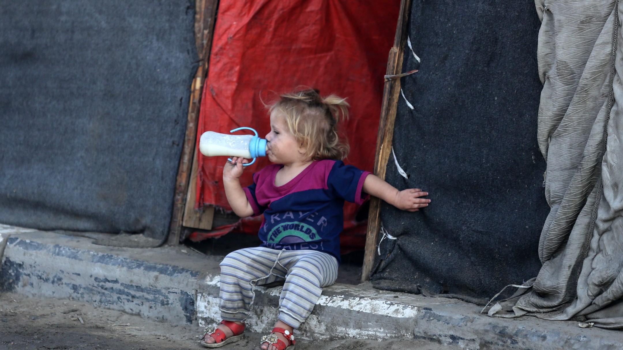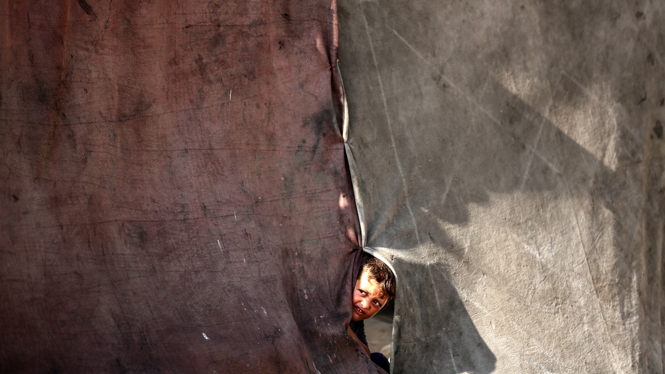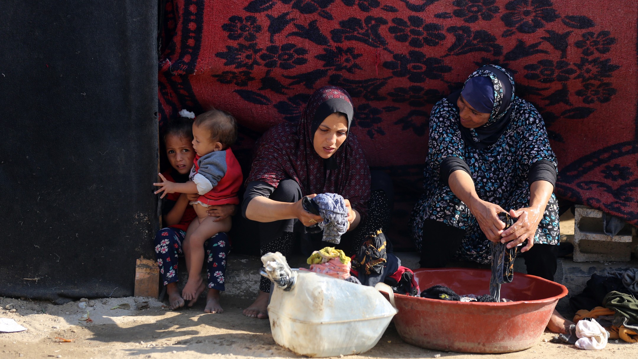 Displaced Palestinian children sit in front of a tent at a make-shift camp for the internally displaced in Deir al-Balah in the central Gaza Strip on October 18, 2024, photo by majdi fasthi