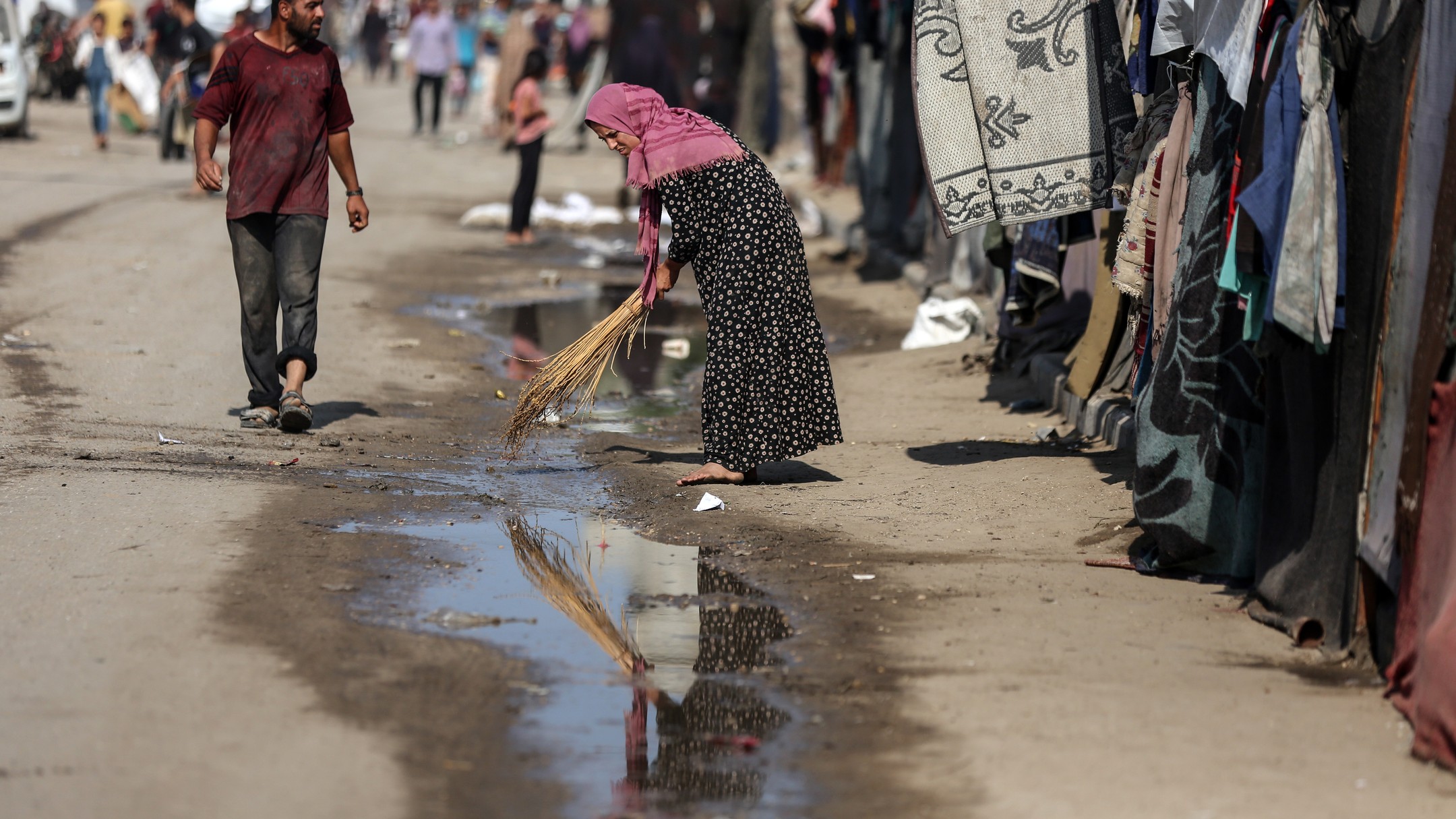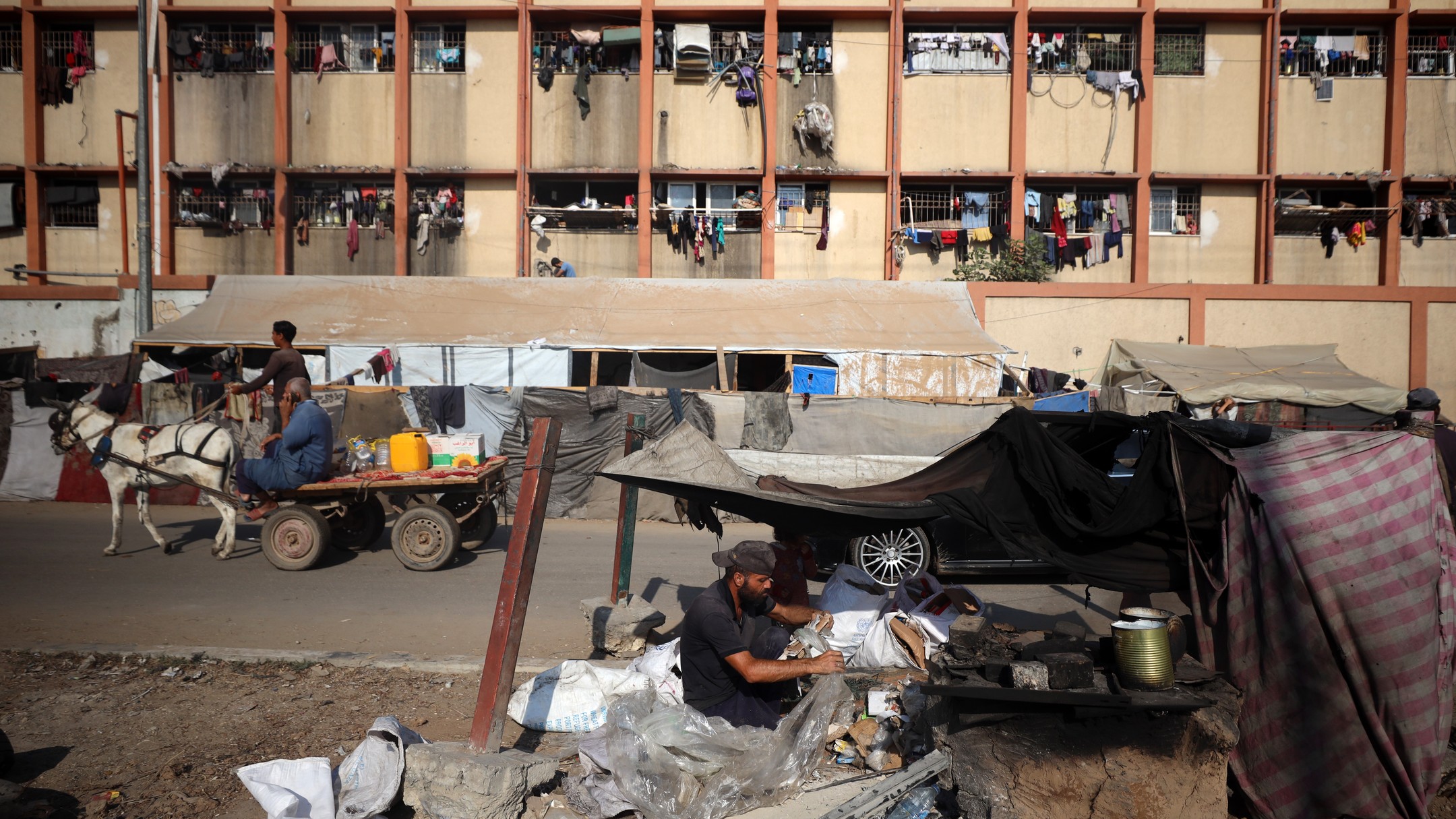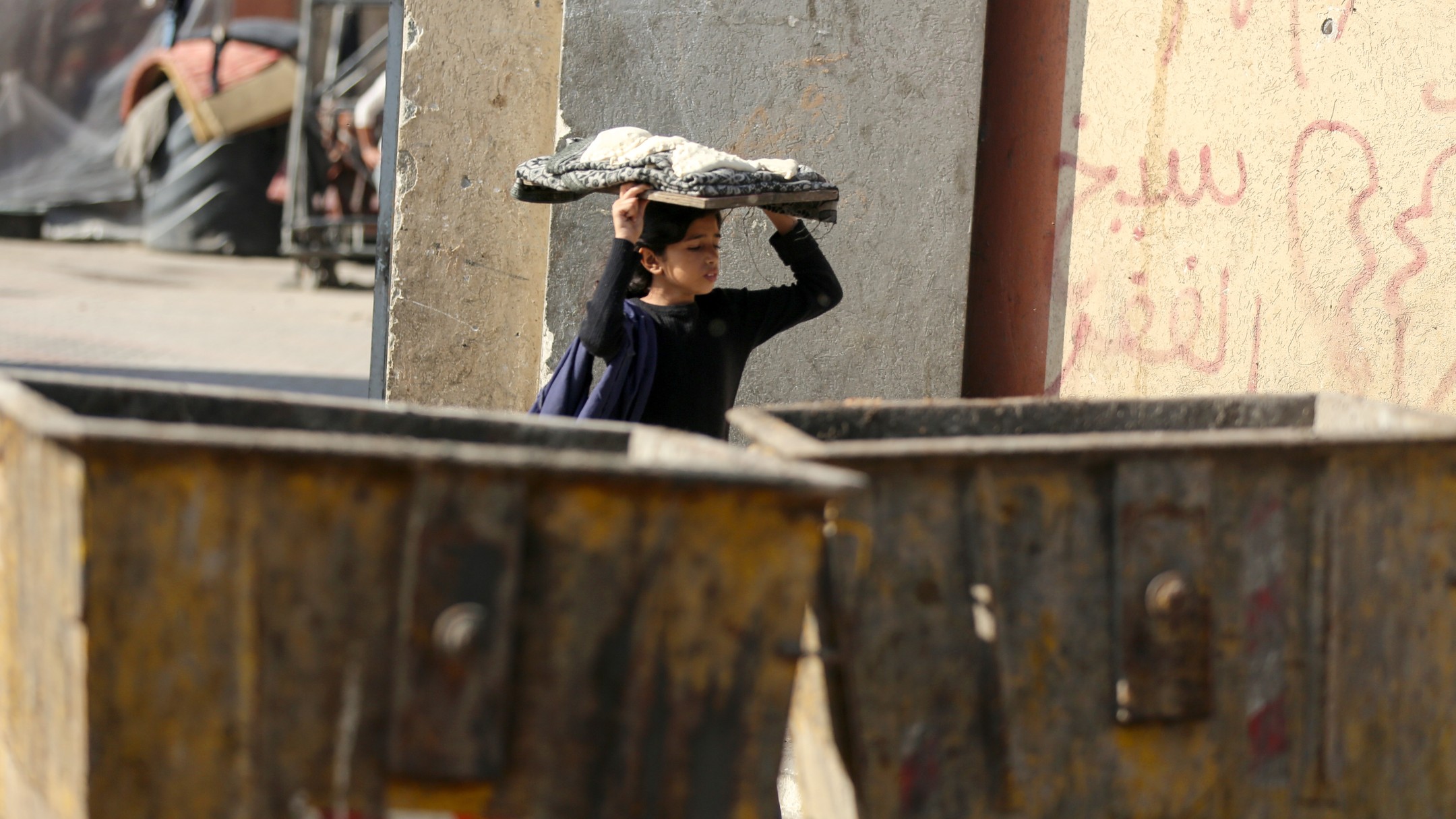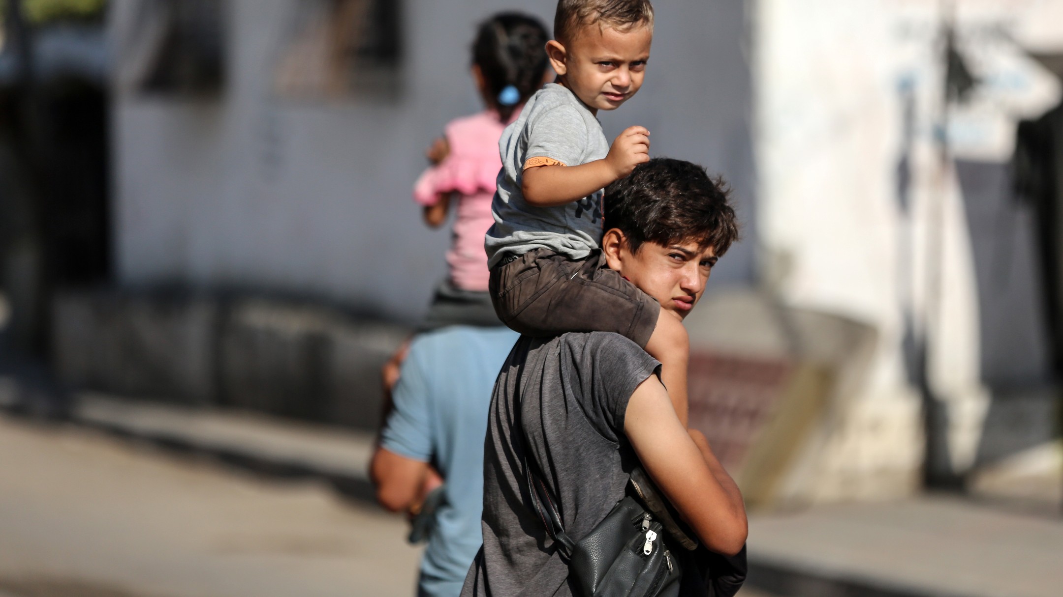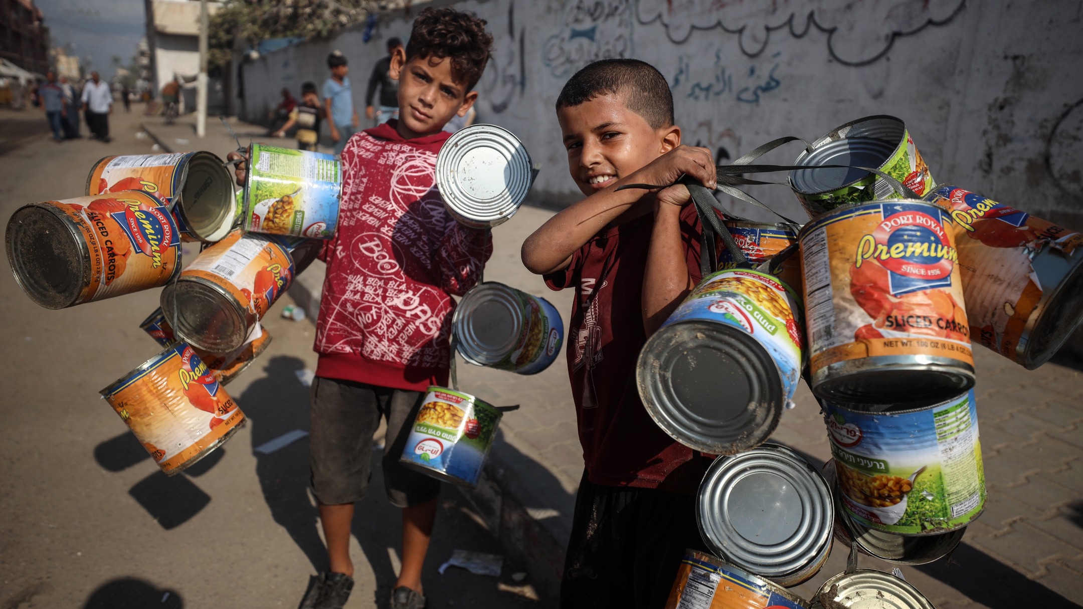 Displaced Palestinian children carry empty cans to sell in the market in Deir al-Balah in the central Gaza Strip on October 18, 2024, photo by majdi fathi