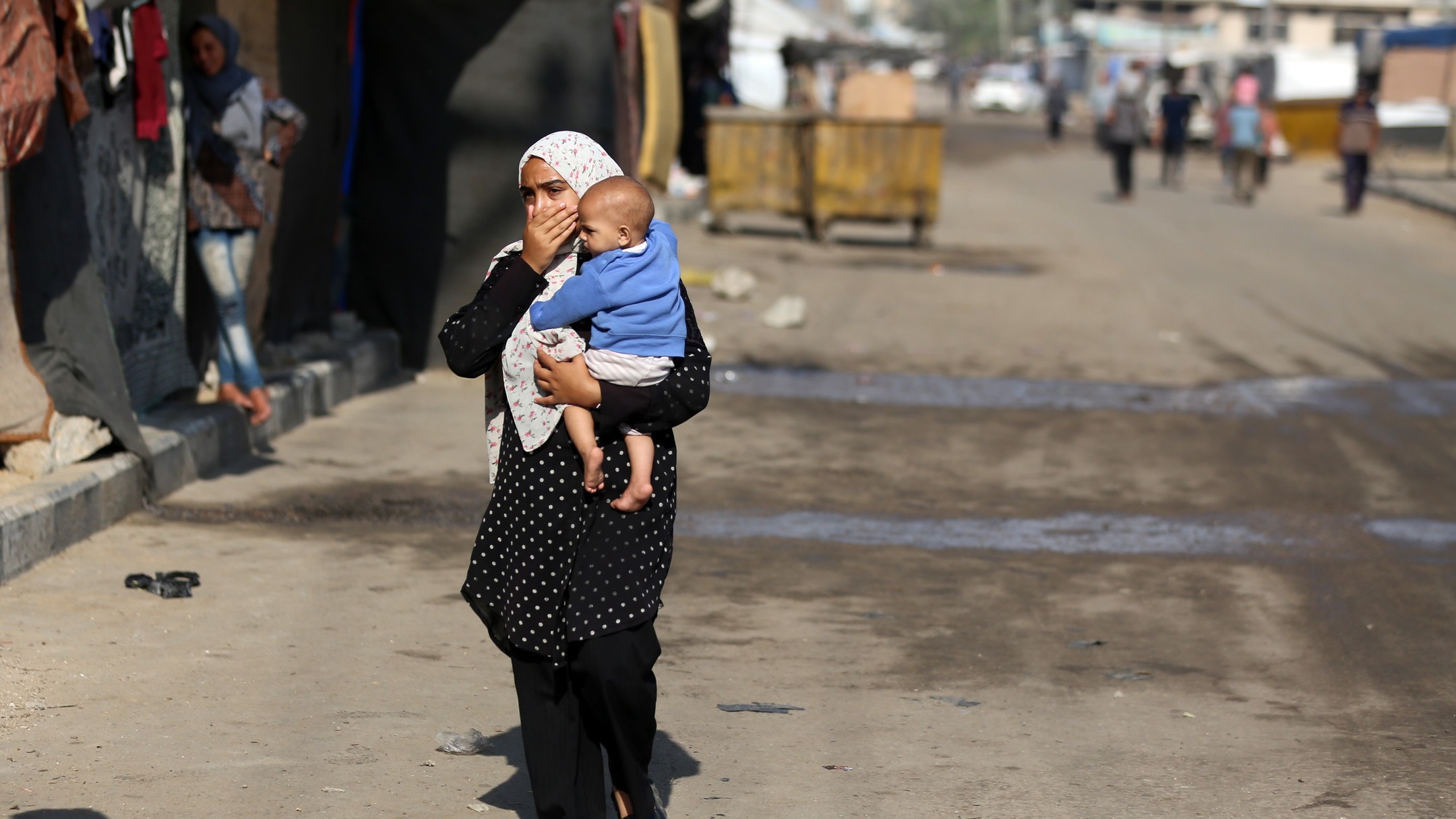 A picture of a mother hugging her child after surviving a horrific massacre in Al-Bureij camp