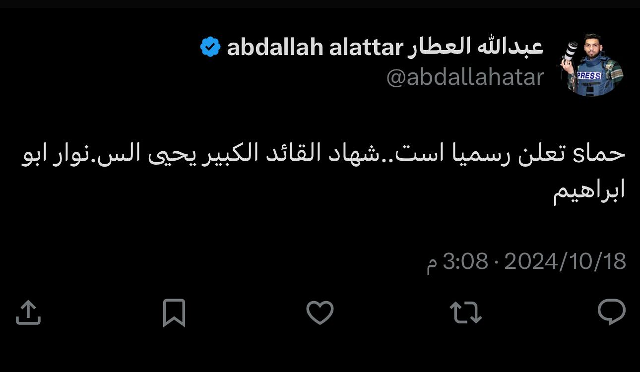 Khalil Al-Hayya, deputy head of the Hamas politburo: "Leader Yahya Sinwar passed while fighting and confronting the occupying army until the last moment of his life."