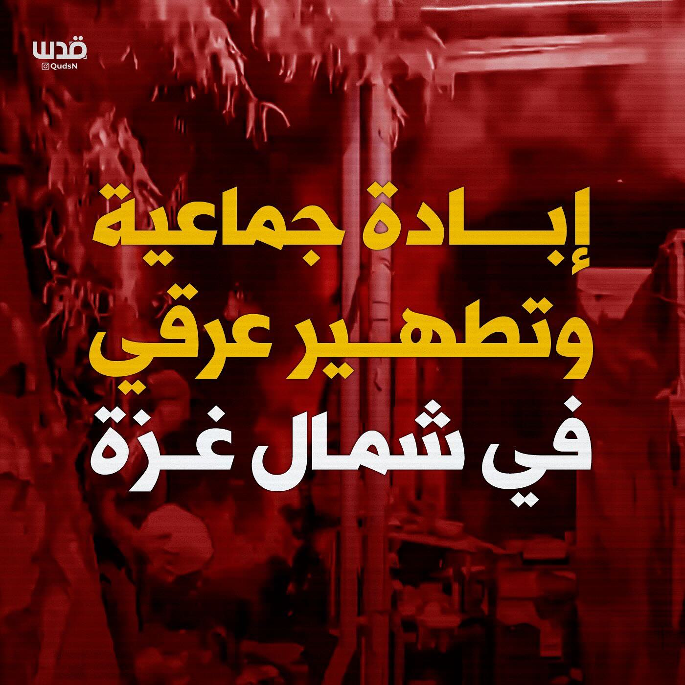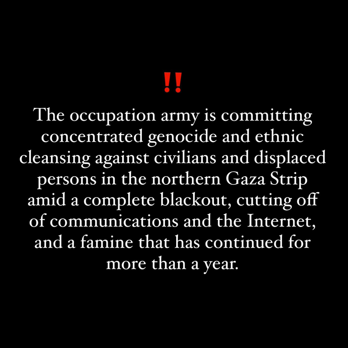 The occupation army is committing concentrated genocide and ethnic cleansing against civilians and displaced persons in the northern Gaza Strip amid a complete blackout, cutting off of communications and the Internet, and a famine that has continued for more than a year. جيش الاحتلال يرتكب إبادة جماعية مركزة وتطهير عرقي بحق المدنيين والنازحين في شمال قطاع غزة وسط تعتيم كامل وقطع للاتصالات والانترنت ومجاعة مستمرة منذ أكثر من عام