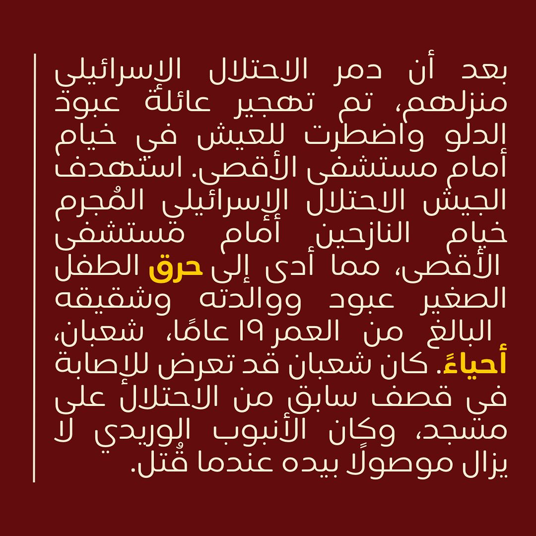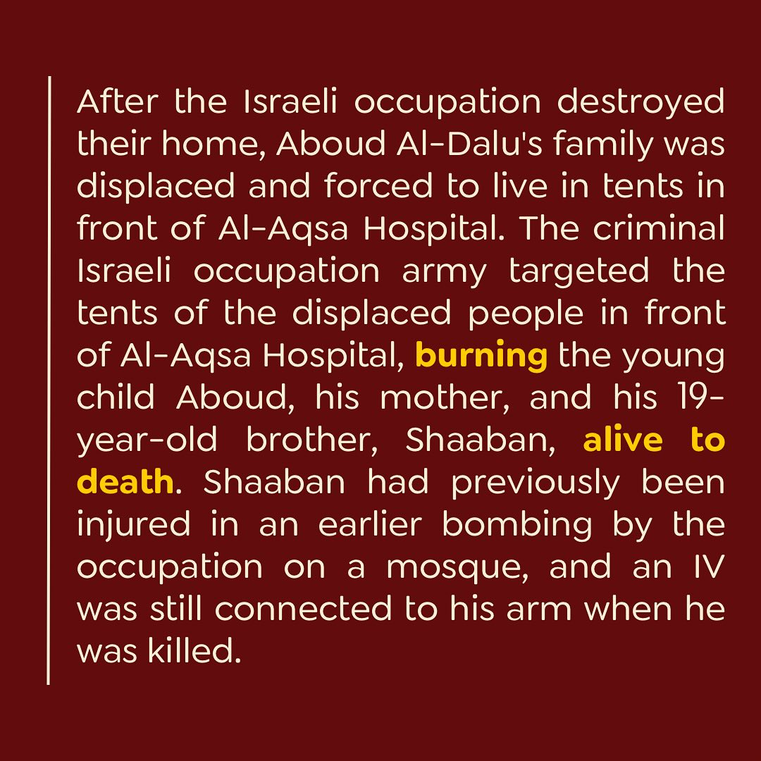 استشها.د الطفل الجميل عبود الدلو محترقا بنار جيش الاحتلال الاسرائيلي، ليلحق بوالدته وشقيقه شعبان . انقذوا ما تبقى من عائلته وساعدوهم بالسفر حتى لا يموتوا جميعا