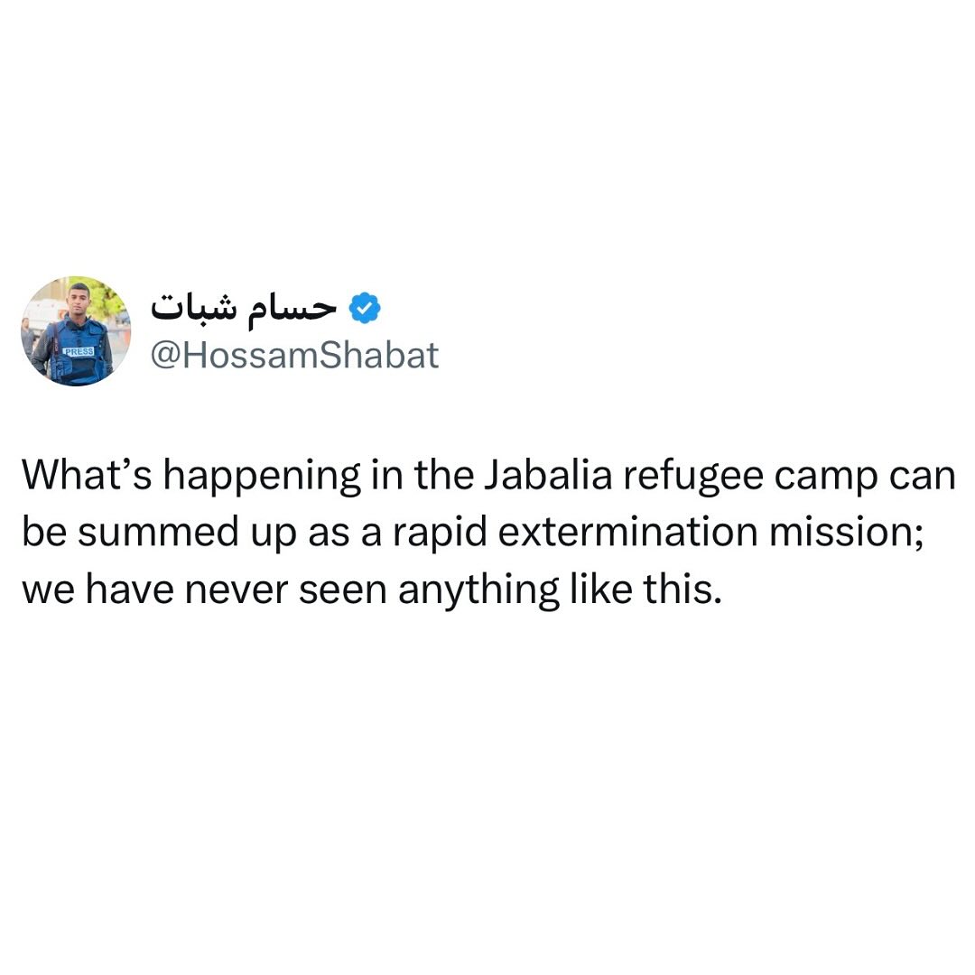 What’s happening in the Jabalia refugee camp can be summed up as a rapid extermination mission; we have never seen anything like this.
