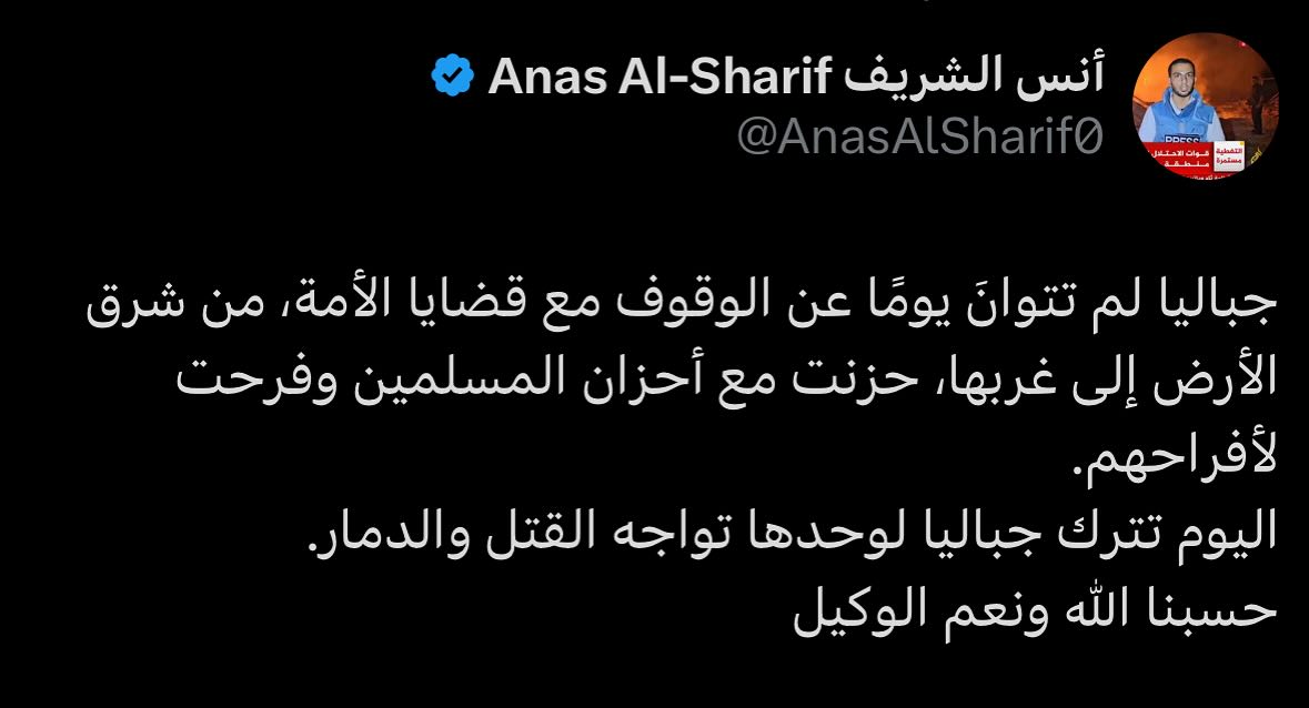 جباليا لم تتوانَ يومًا عن الوقوف مع قضايا الأمة، من شرق الأرض إلى غربها، حزنت مع أحزان المسلمين وفرحت لأفراحهم. اليوم تترك جباليا لوحدها تواجه القتل والدمار. حسبنا الله ونعم الوكيل #نحن_نباد #شمال_غزة_يباد