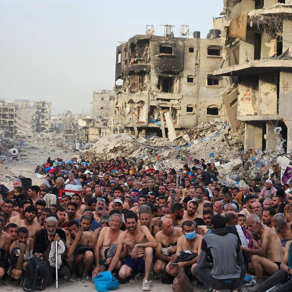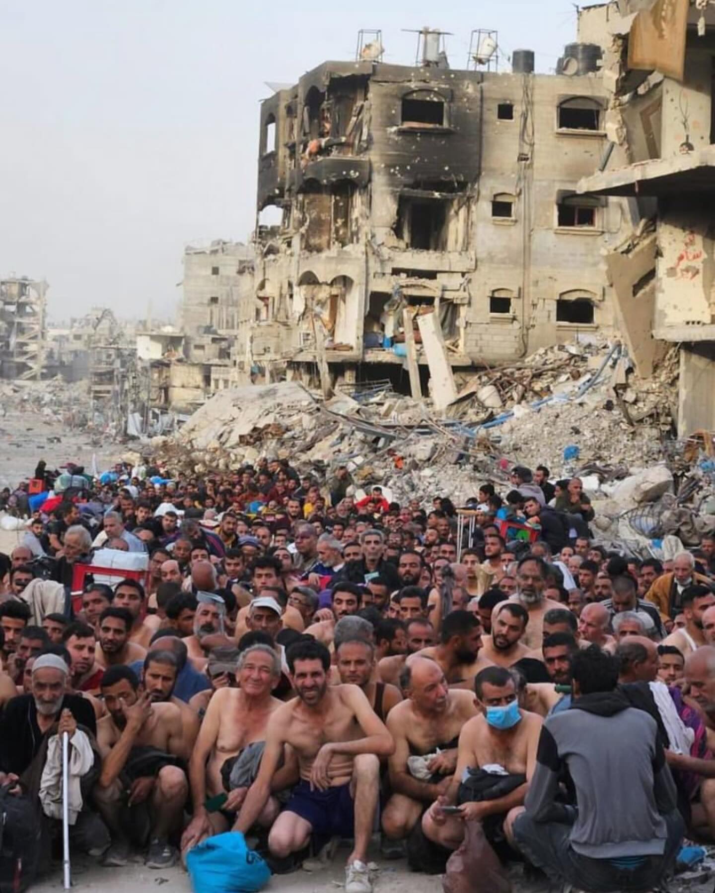 Dozens of Palestinians including elderlies were detained and forced to take off their clothes by the occupation forces in the north of Gaza. عشرات من المعتقلين بينهم مسنين اجبروا على خلع ملابسهم في شمال غزة