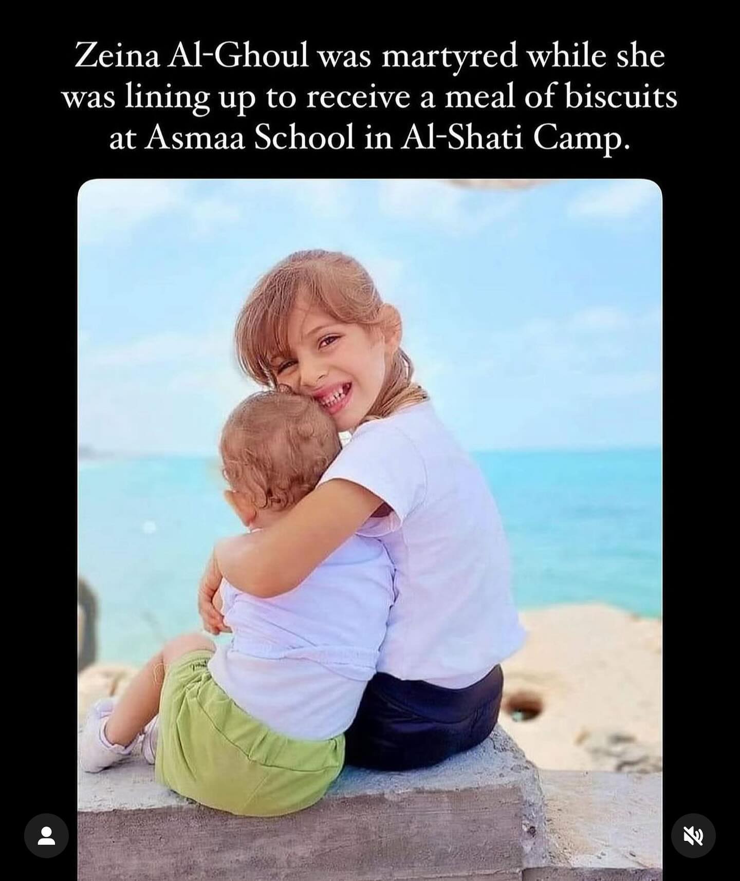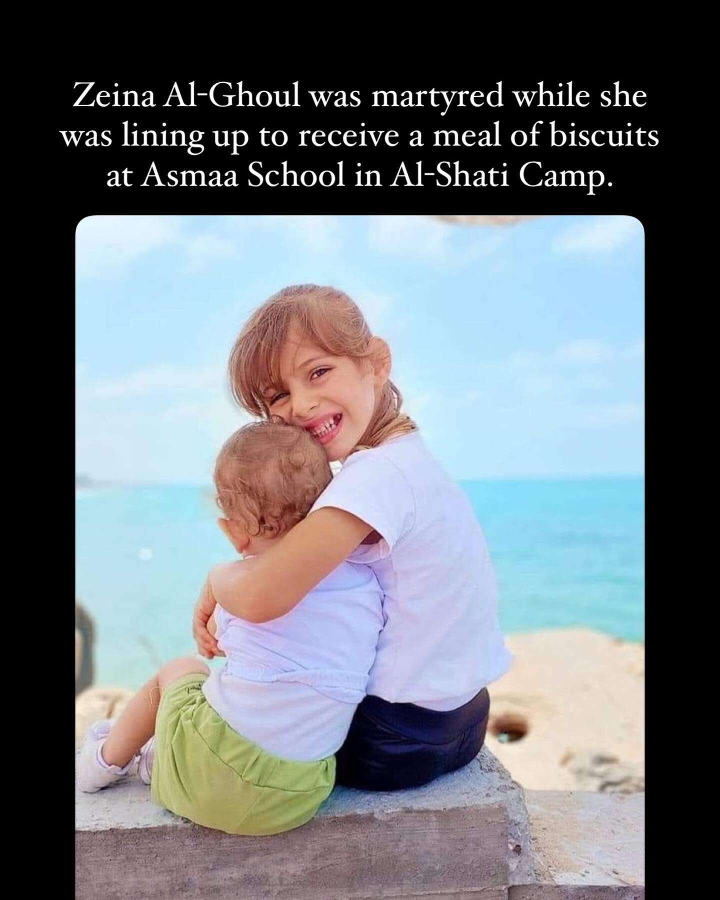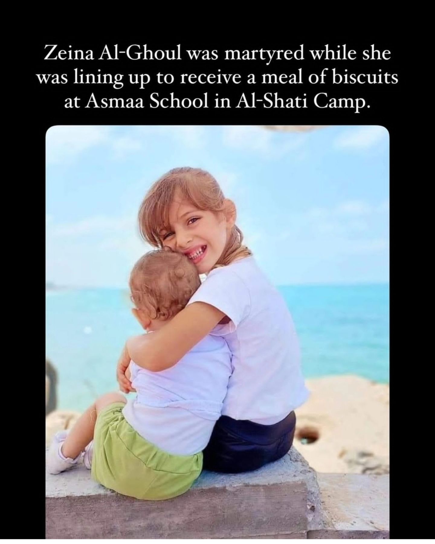 Tragically, 9-year-old Zaina Al-Ghoul was killed today by an Israeli airstrike while waiting to receive a biscuit at Asmaa School in the Shati refugee camp in Gaza City. الطفلة زينة الغول استشهدت عندما كانت تصطف لاستلام وجبة بسكويت في مدرسة أسماء التي استهدفها الاحتلال في مخيم الشاطئ غرب مدينة غزة.