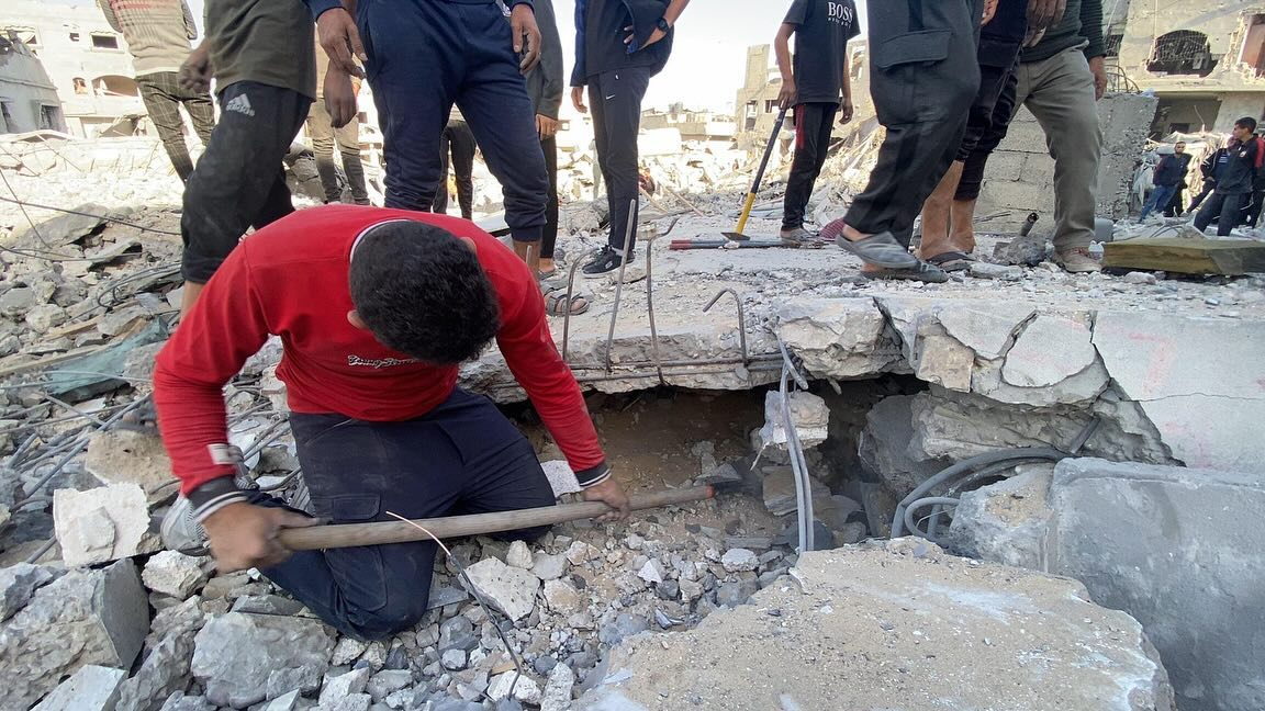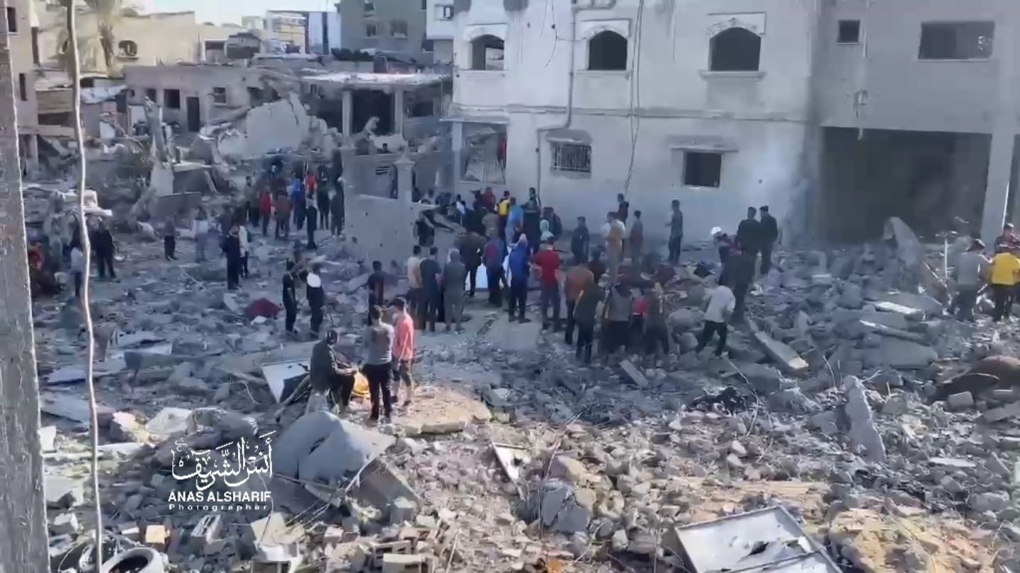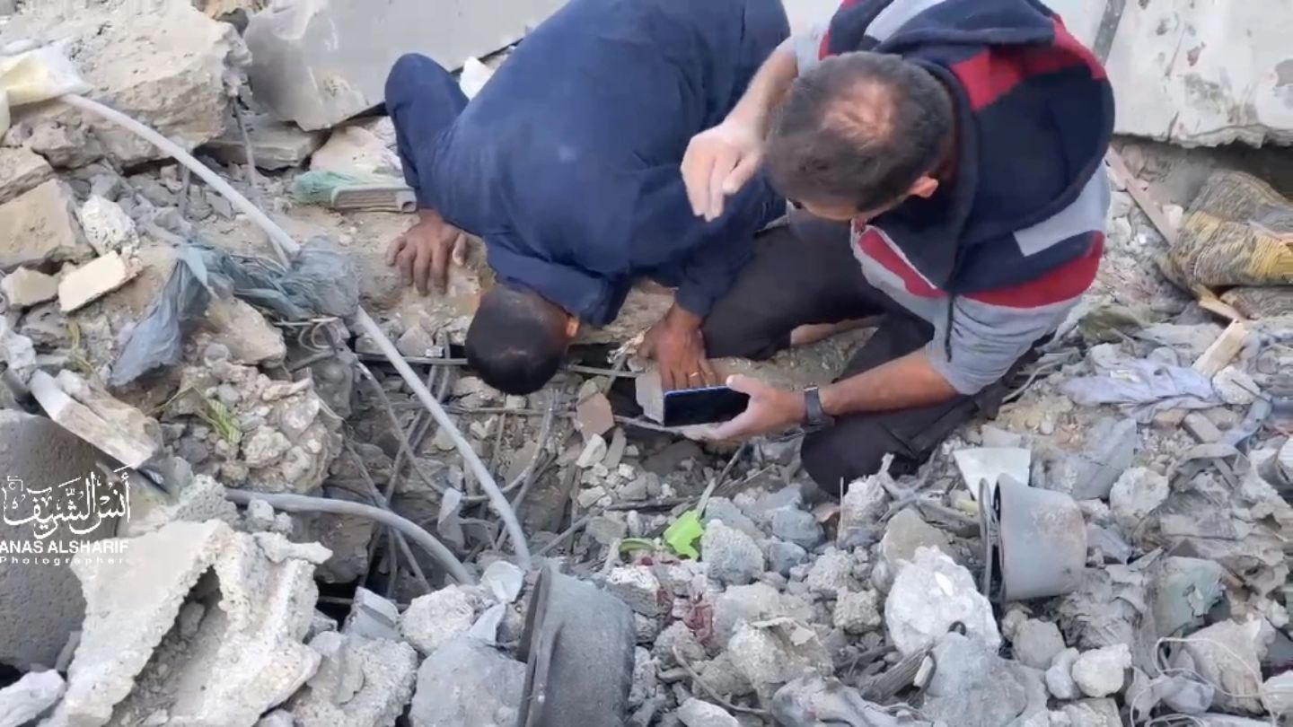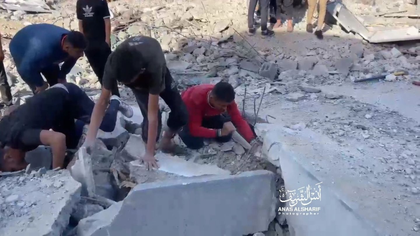 لحظة إنتشال احد الشهداء داخل مدرسة أسماء في مخيم الشاطىء The moment one of the martyrs was retried inside Asma School in Al-Sha'i camp