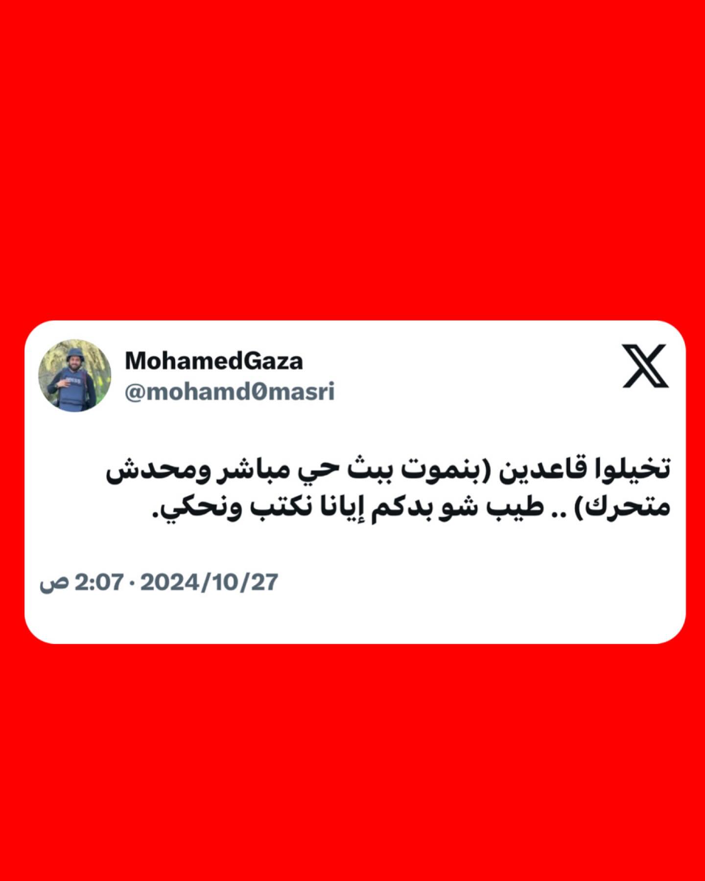 نحن هنا لا نشعر بالعار، هذا المشهد بعد عام كامل من الإبادة وهؤلاء الجبال لم يكن خيار النزوح جنوبا ضمن خياراتهم.. المهم أنا أعتز بهم فردا فردا، قسما لن يغتالوا عزة نفسنا، لن يغتالوا حبنا للحياة، لن يغتالوا استمرارنا، نحب الحياة ونطلبها بأفعالنا والكل يشهد، هؤلاء أبناء المخيم. We do not feel ashamed here. This scene comes after a whole year of genocide, and these people did not have the option of moving south among their choices. The important thing is that I am proud of them individually. I swear that they will not assassinate our pride, they will not assassinate our love for life, they will not assassinate our continuity. We love life and we seek it with our actions, and everyone can testify to that. We are the children of the camp.