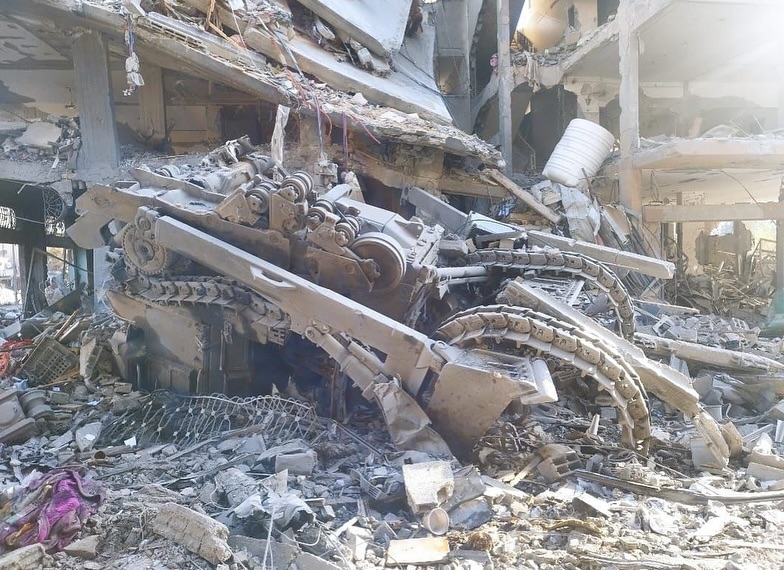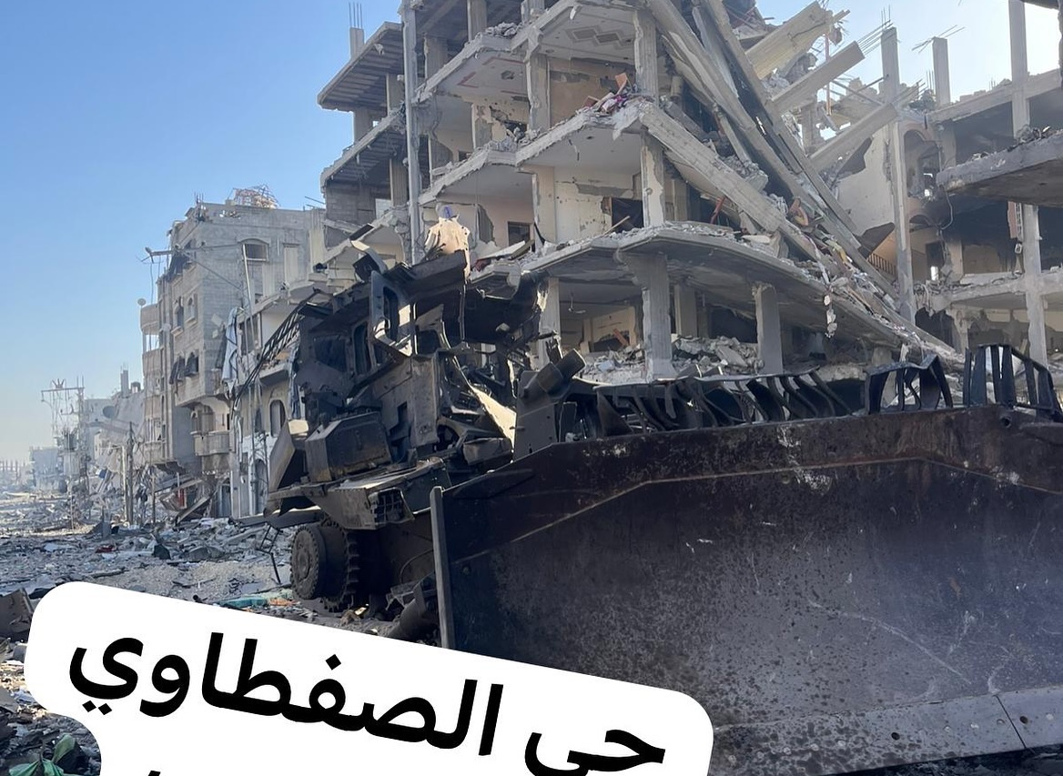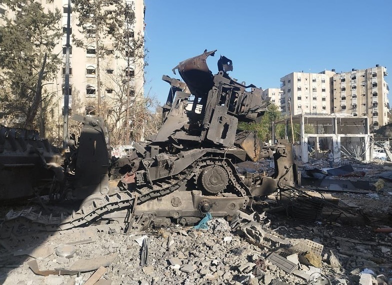Destroyed Israeli bulldozers left behind in Saftawi neighborhood north of Gaza city after a partial withdraw of the occupation forces. Huge destruction done by the Israeli occupation forces in the surrounding homes and buildings in addition to killing dozens of Palestinians. The Palestinians resistance with the simple weapons they have resisted the invasion forces and destroyed few tanks and bulldozers.
