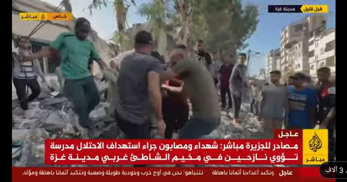 ارتقاء ثمانية نازحين باستهداف طائرات الاحتلال لمركز ايواء داخل مدرسة اسماء بمخيم الشاطئ غرب مدينة غزة Eight displaced people were raised by the occupation planes targeting a shelter center inside Asmaa School in Al-Shati camp west of Gaza City