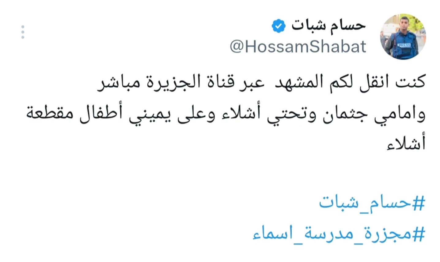 “ Our children killed before our eyes and we bury them with our own hands. They killed my son. Because we are delivering a humanitarian message, our children are being killed. I buried my son by the hospital wall.” @dr.hussam73, Director of Kamal Adwan Hospital. Translated by @khaledyousry22 اولادنا بينقتلوا امامنا وندفنهم بايدينا. قتلوا ابني. عشان احنا بنقدم رساله انسانيه اولادنا بيقتلوا. دفنت ابني في سور المستشفى. د.حسام أبو صفية، مدير مستشفى كمال عدوان.