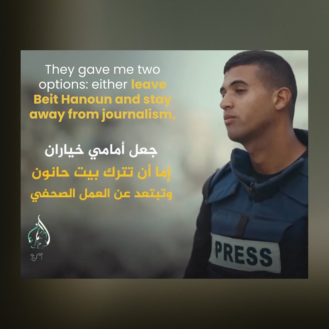 They gave me two options: „either leave Beit Hanoun and stay away from journalism, or have my home bombed.“ جَعَلَ أمامي خيارين: إما أن تترك بيت حانون وتبتعد عن العمل الصحفي، أو أن يتعرض منزلك للقصف.