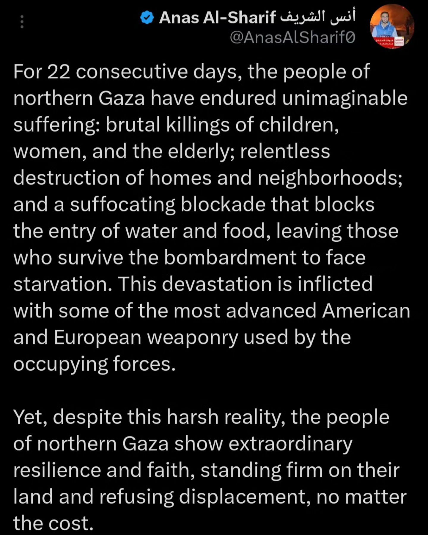 For 22 consecutive days, the people of northern Gaza have endured unimaginable suffering: brutal killings of children, women, and the elderly; relentless destruction of homes and neighborhoods; and a suffocating blockade that blocks the entry of water and food, leaving those who survive the bombardment to face starvation. This devastation is inflicted with some of the most advanced American and European weaponry used by the occupying forces. Yet, despite this harsh reality, the people of northern Gaza show extraordinary resilience and faith, standing firm on their land and refusing displacement, no matter the cost.