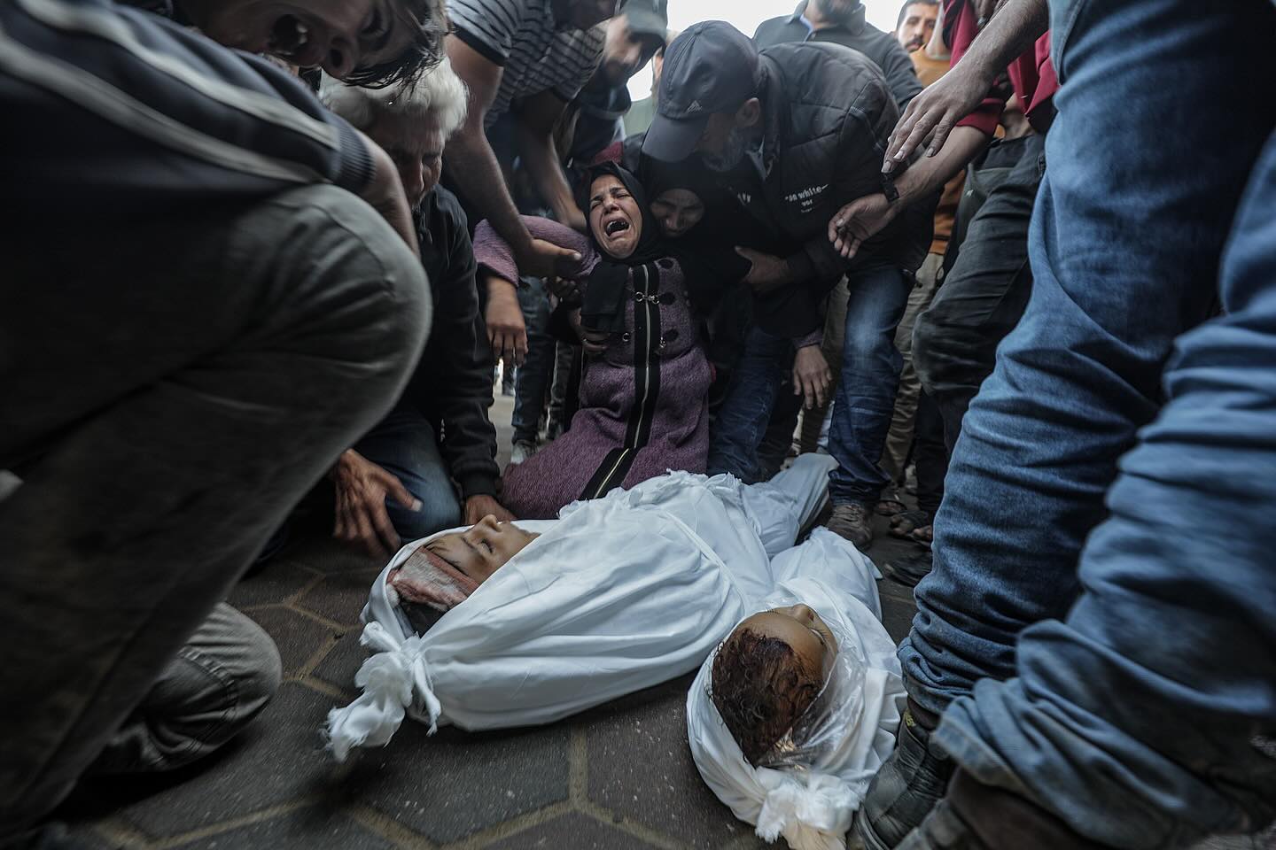 A father bids farewell to his children who were killed in an Israeli air strike that targeted a group of civilians in the market of the Zawayda refugee camp, central Gaza. By @nahed_hajjaj99 فلسطيني يودع اطفاله الذين ارتقوا الليلة نتيجة استهداف مجموعة مواطنين في سوق مخيم الزوايدة وسط القطاع