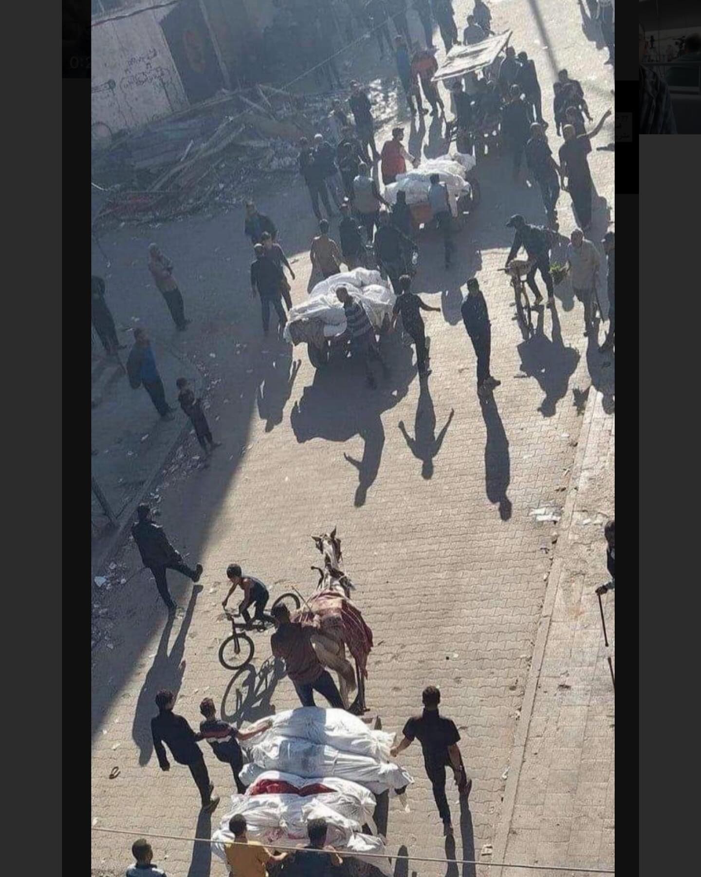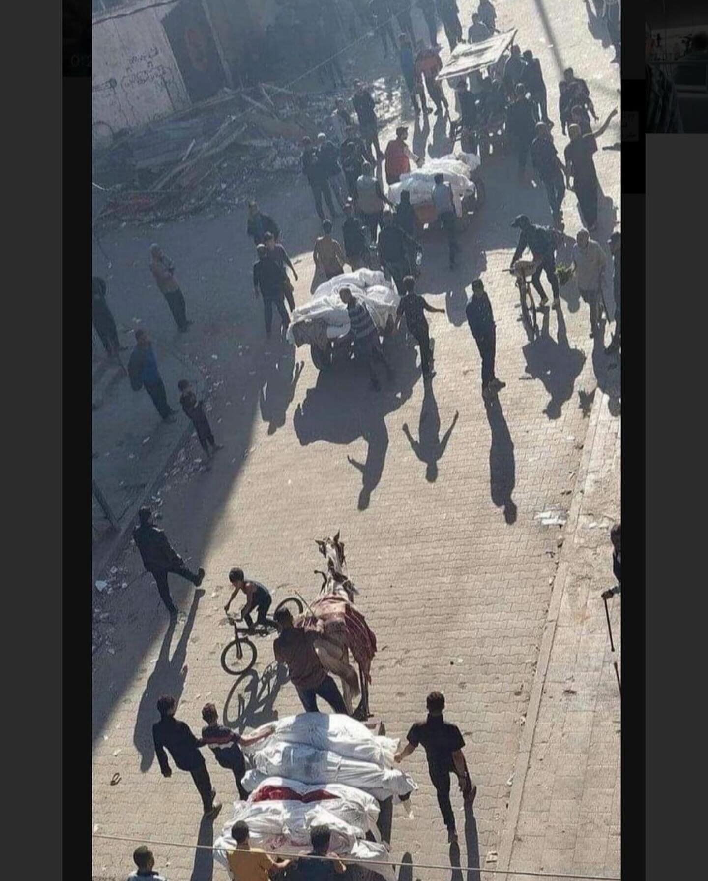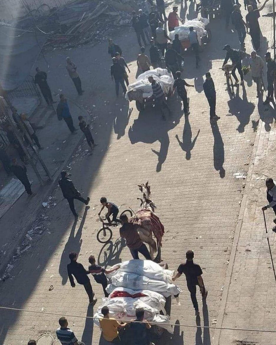 عشرات الش.هداء يجري الآن نقلهم عبر العربات لدفنهم في منطقة السوق بعد مجزرة مروعة ارتكبها الاحتلال صباحا بمشروع بيت لاهيا. Dozens of martyrs are now being transported through vehicles to be buried in the market area after a horrific massacre committed by the occupation in the morning in the Beit Lahia project.