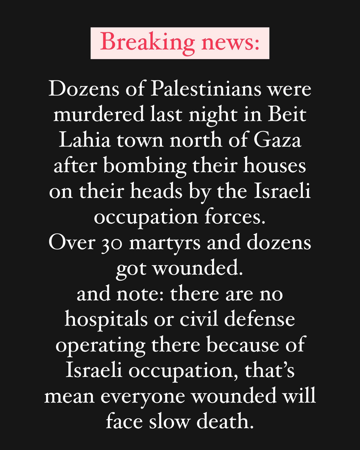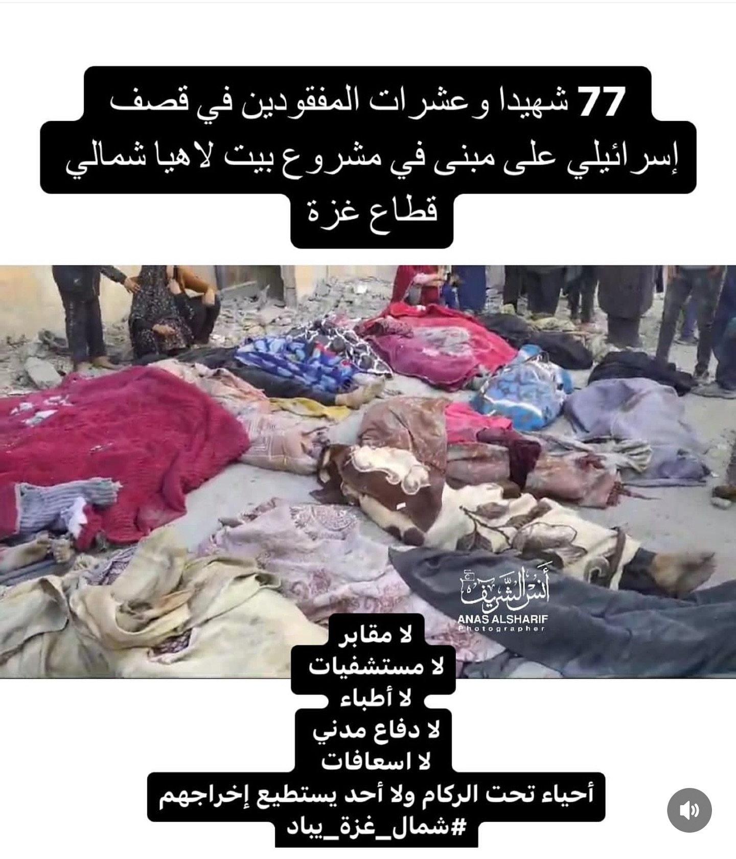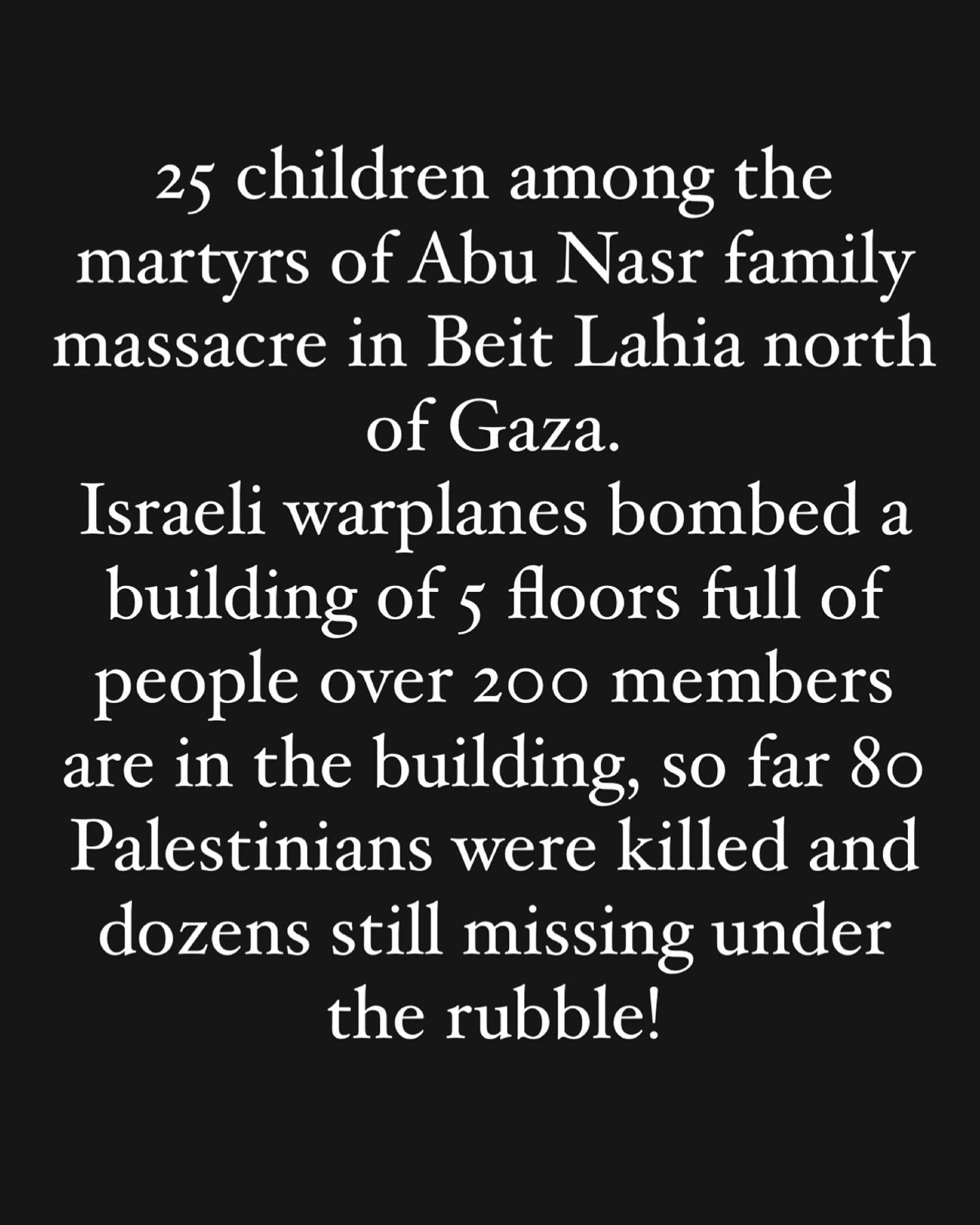 More than 77 martyrs, including 17 children, and dozens injured lie under the rubble of a five-story residential building belonging to the “Abu Nasr” family, which was bombed by the Israeli occupation last night as its displaced residents slept in the Beit Lahia Project area, north of the Gaza Strip. Translated by @khaledyousry22 أكثر من 77 شهيداً، بينهم 17 طفلاً، وعشرات الجرحى تحت ركام مبنى سكني مكون من 5 طوابق يعود لعائلة “أبو نصر”، قصفه الاحتلال الإسرائيلي الليلة الماضية على ساكنيه النازحين وهم نيام في منطقة مشروع بيت لاهيا شمال قطاع غزة