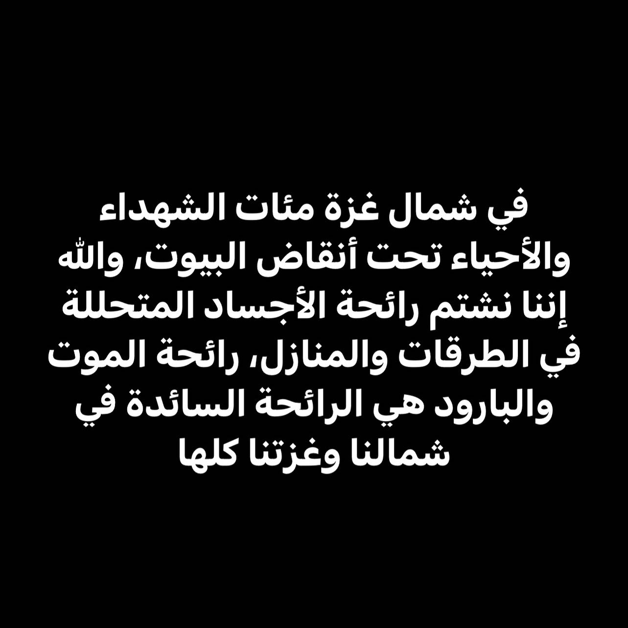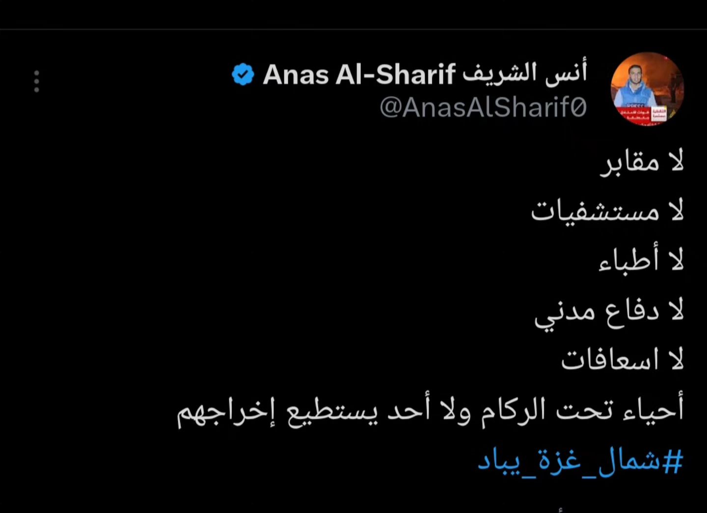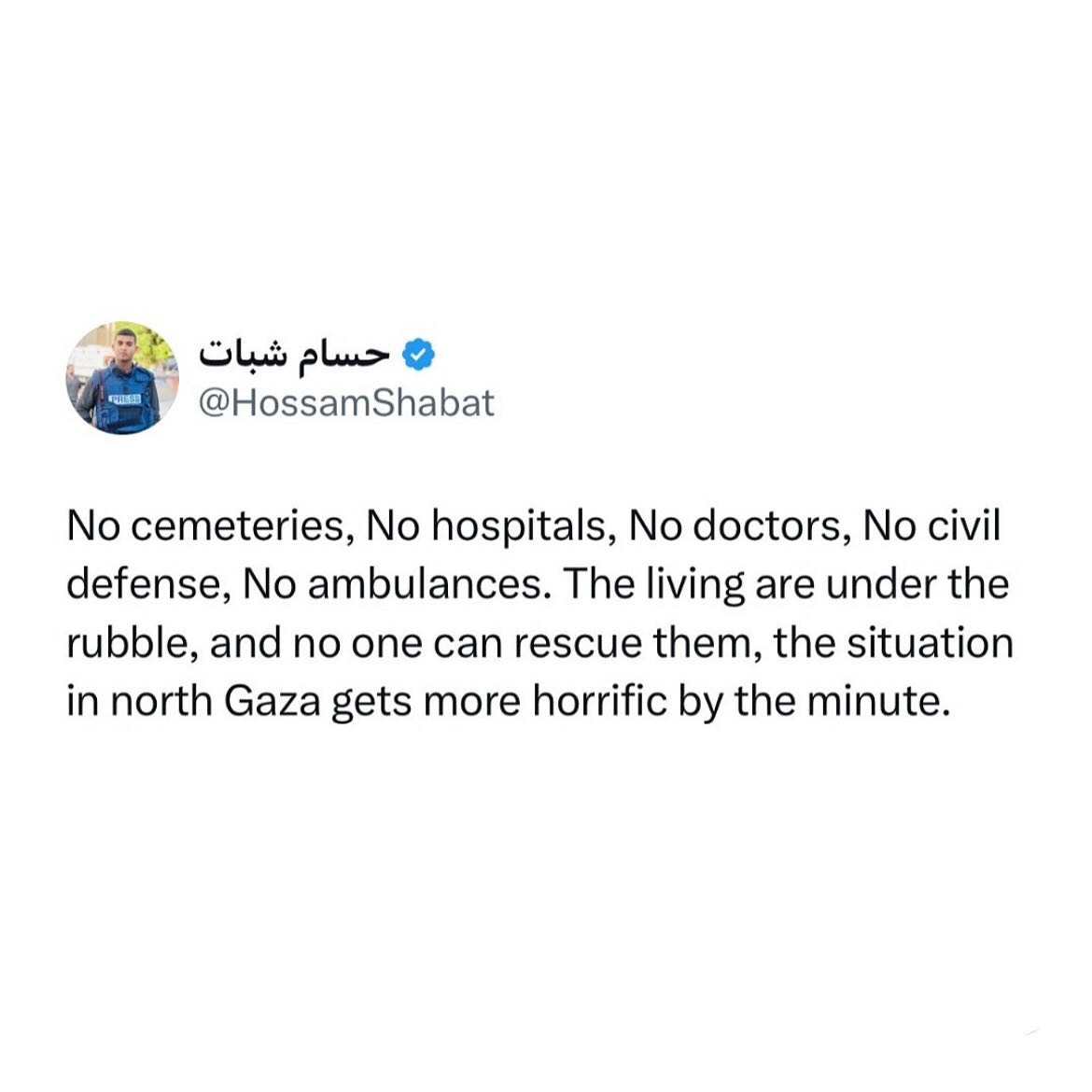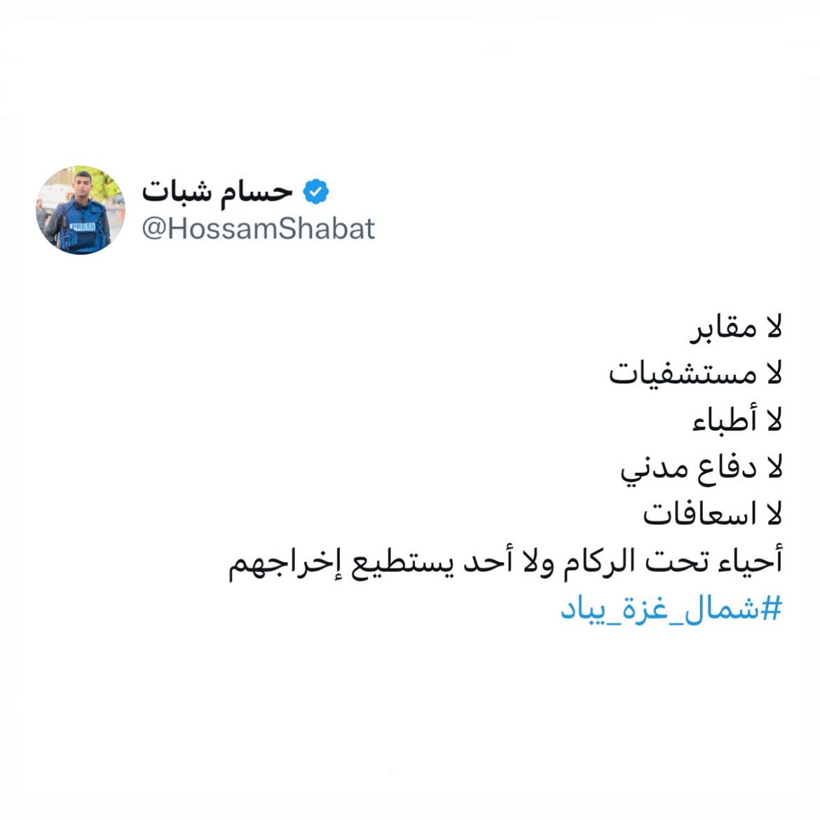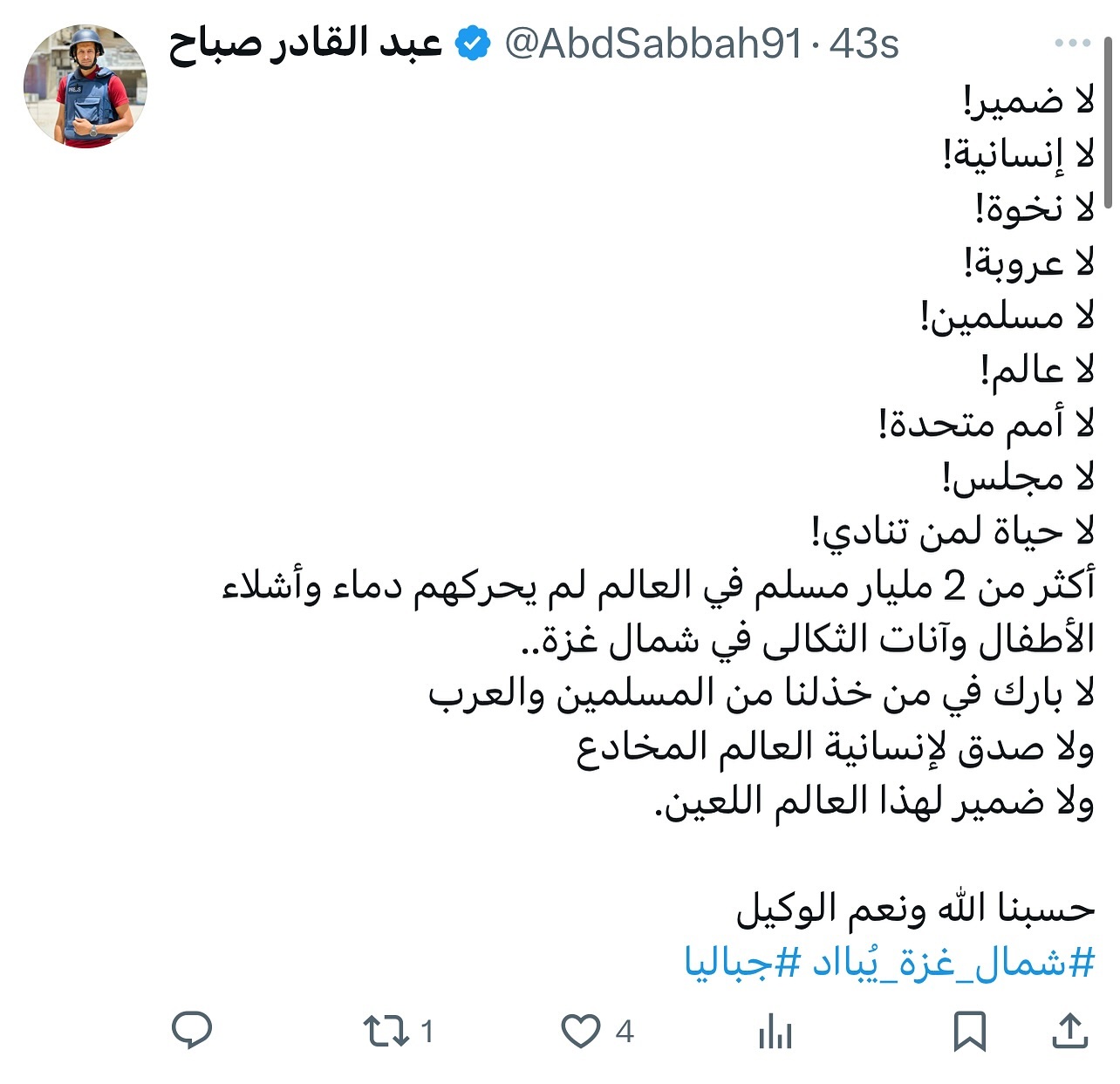 No conscience! No humanity! No chivalry! No Arabism! No Muslims! No world! No United Nations! No council! No life for those who call! More than 2 billion Muslims in the world were not moved by the blood and remains of children and the groans of the bereaved in northern Gaza.. No blessing for those Muslims and Arabs who let us down No truth to the humanity of the deceitful world No conscience for this damned world. God is sufficient for us, and He is the best Disposer of affairs #North_Gaza_is_being_annihilated #jabalia