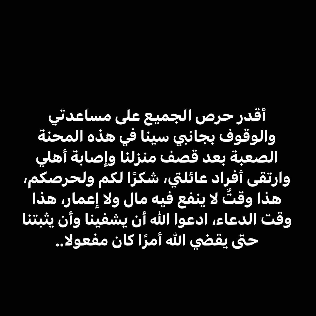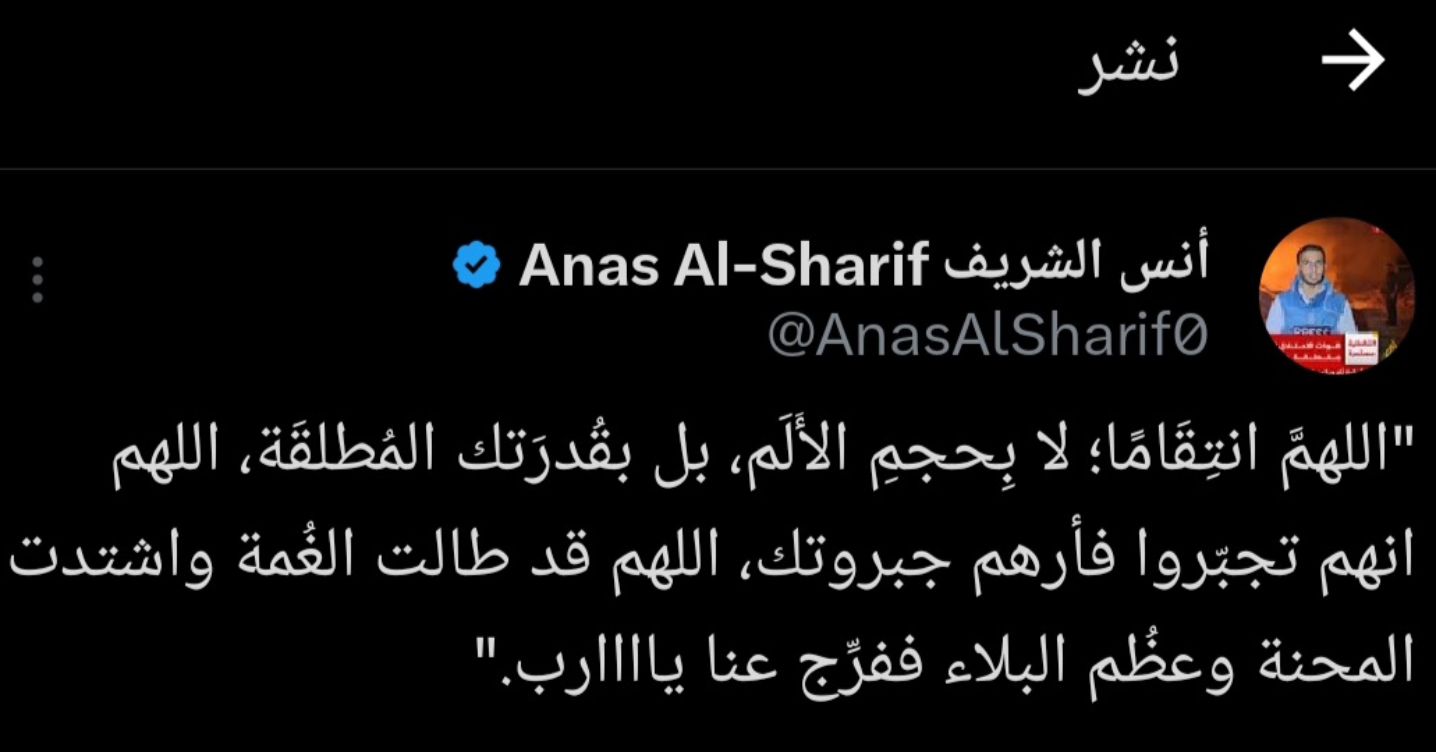"اللهمَّ انتِقَامًا؛ لا بِحجمِ الأَلَم، بل بقُدرَتك المُطلقَة، اللهم انهم تجبّروا فأرهم جبروتك، اللهم قد طالت الغُمة واشتدت المحنة وعظُم البلاء ففرِّج عنا ياااارب."